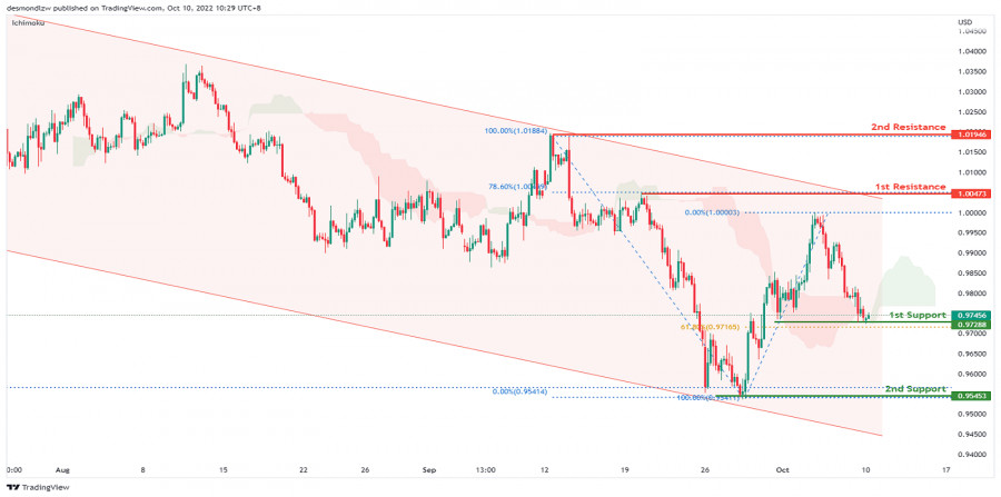 EUR/USD: ожидается усиление медвежьего импульса. Прогноз на 10 октября 2022 г.ИнстаФорекс - Instaforex, 3 года назад На 4-часовом графике пара EUR/USD движется вдоль нисходящей линии тренда, при этом цена движется ниже облака ишимоку, что указывает на медвежий импульс. Цена тестирует 1-й уровень поддержки 0.9728, соответствующий 61.8% уровню коррекции Фибоначчи. Если цена пробьет этот уровень, медвежий импульс направит ее ко 2-му уровню поддержки 0.9545, соответствующему уровню свинг-лоу и уровню расширения Фибоначчи 161.8%. В качестве альтернативы цена может протестировать 1-й уровень сопротивления 1.0047, который соответствует уровню коррекции 78.6%. Если цена пробьет этот уровень, она сможет протестировать 2-й уровень сопротивления 1.0194, где расположен предыдущий уровень свинг-хай. Торговая рекомендация Вход: 0.9745 Условия для входа: вход в продажу на прорыве, 61.8% уровень коррекции Фибоначчи Тейк-профит: 0.9545 Условия для фиксации прибыли: свинг-лоу, уровень расширения Фибоначчи 161.8% Стоп-лосс: 0.9897 Условия для активации ордера стоп-лосс: предыдущий уровень свинг-лоу, уровень коррекции Фибоначчи 23.6% Материал предоставлен компанией InstaForex - www.instaforex.com |