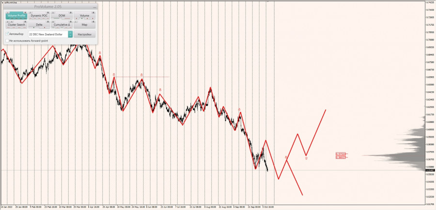 Долгосрочная тенденция: в шорт. Максимальное скопление объемов текущего контракта расположено в диапазоне по котировкам 0.56937-0.57324. В настоящий момент по паре совершаются инвестиционные операции ниже, указывая на силу продавцов.