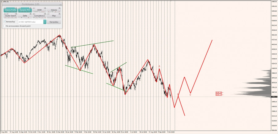 Долгосрочная тенденция: в шорт. Максимальное скопление объемов текущего контракта расположено в диапазоне, по котировкам 3635.17-3678.29. В настоящий момент по SNP500 совершаются инвестиционные операции ниже, указывая на силу продавцов.