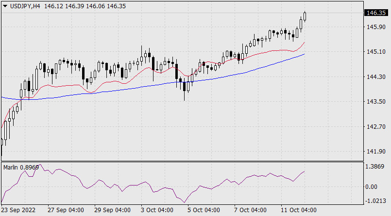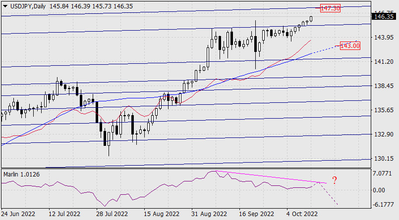 Прогноз по USD/JPY на 12 октября 2022 годаИнстаФорекс - Instaforex, 3 года назад Валютная пара USD/JPY после закрепления над ближайшей вложенной линией ценового канала на дневном графике ускорила рост к следующей целевой линии в область отметки 147.30. Здесь, по основному сценарию, мы ожидаем формирование дивергенции с осциллятором Марлин и разворот в глубокую коррекцию, предположительно до линии Крузенштерна (143.00).