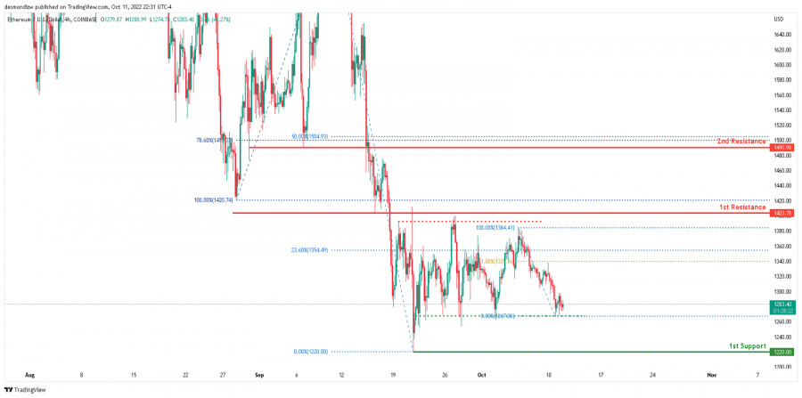 ETH/USD: ожидается усиление медвежьего импульса. Прогноз на 12 октября 2022ИнстаФорекс - Instaforex, 3 года назад На 4-часовом графике пара ETH/USD торгуется в нисходящем направлении. В настоящее время цена находится под облаком Ишимоку, что подтверждает факт наличия медвежьего импульса. Ночью цена продолжила свое движение вниз. В течение последних трех недель пара консолидировалась между областями 1403 и 1220. Если медвежий импульс сохранится, ожидается, что цена направится к 1-му уровню поддержки 1220.00, соответствующему 0% уровню коррекции Фибоначчи. Торговая рекомендация Вход: 1340 Условия для входа: уровень коррекции Фибоначчи 61.8% Тейк-профит: 1220.00 Условия для фиксации прибыли: 0% уровень коррекции Фибоначчи и предыдущий лоу Стоп-лосс: 1384.41 Условия для активации ордера стоп-лосс: чуть выше уровня коррекции Фибоначчи 23.6% и области, где расположен уровень коррекции Фибоначчи 100% Материал предоставлен компанией InstaForex - www.instaforex.com |