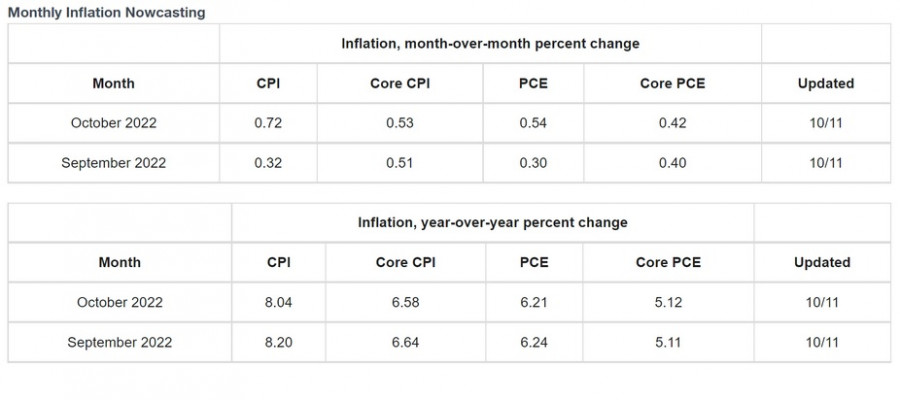 Суть в том, что вероятность повышения ставки на 75 базисных пунктов в ноябре остается повышенной и составляет 78,4%. Федеральная резервная система не ждет данных из отчета CPI в четверг. Это связано с тем, что Федеральный резервный банк Кливленда использует систему моделирования, использующую текущие данные, которая называется «Прогноз инфляции».