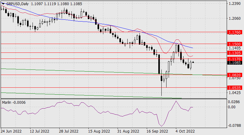 Прогноз по GBP/USD на 13 октября 2022 годаИнстаФорекс - Instaforex, 3 года назад Вчера фунт стерлингов подрос на 130 пунктов, вернувшись в диапазон понедельника. До сопротивления 1.1170 цена не дотянула, чему помешал осциллятор Марлин, развернувшийся вниз от нулевой линии (daily). Следование цены за осциллятором указывает на слабость цены. Как следствие, цена может быстро снизиться до ближайшей поддержке (1.0820) и даже попытается закрепиться под ней.