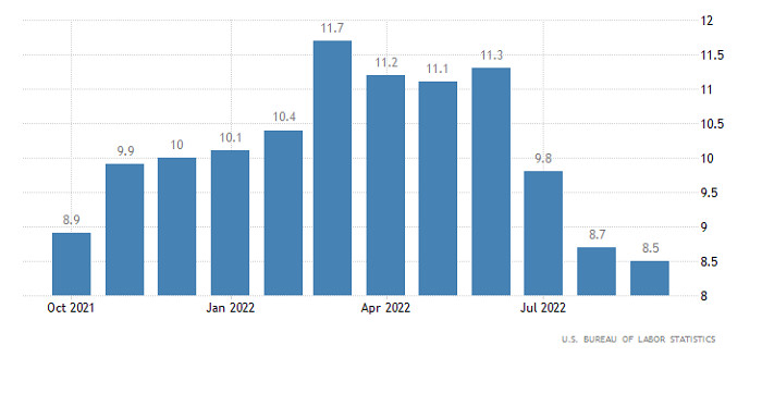 Горящий прогноз по GBP/USD от 13.10.2022ИнстаФорекс - Instaforex, 3 года назад Предполагалось, что темпы роста промышленного производства в Великобритании ускорятся с 1,1% до 1,3%. Однако, предыдущие данные пересмотрели в худшую сторону, до -3,2%, так что британская промышленность месяцем ранее не росла, а сильно снижалась. Более того, темпы спада даже ускорились до -5,2%. Так что нет никаких сомнений, что британская экономика уверенно скатывается в рецессию. Но на этом плохие новости для фунта не закончились, так как индекс цен производителей в Соединенных Штатах снизился с 8,7% до 8,5%, вместо прогнозировавшихся 8,4%. То есть, инфляция в Соединенных Штатах снижается заметно медленнее ожиданий, что скорее всего будет вынуждать Федеральную Резервную Систему продолжать повышать процентные ставки прежними темпами. Индекс цен производителей (Соединенные Штаты): Однако, несмотря на все это, фунт рос. Поводом стали слухи о том, что Банк Англии, пусть и в ограниченном виде, но все же продолжит выкупать государственные облигации после 14 октября. В частности, у пенсионных фондов, с целью недопущения из банкротства. Пока это лишь слухи, но этого оказалось достаточно для того чтобы усилить позиции фунта, так как именно финансовое состояние пенсионных фондов сейчас является одной из главных угроз для британской экономики. По крайней мере на данный момент. И есть опасения, что если Банк Англии завершит программу выкупа активов, ряд пенсионных фондов может обанкротиться и потянуть за собой всю британскую экономику. Тем не менее, даже эти проблемы сегодня отойдут на второй план, так как в центре внимания окажутся данные по инфляции в Соединенных Штатах, которые и дадут окончательный ответ на вопрос о дальнейших темпах повышения ставки рефинансирования Федеральной Резервной Системы. Судя по прогнозам, темпы роста потребительских цен могут замедлиться с 8,3% до 8,2%. Что не так уж и много. Но речь все равно идет о снижении инфляции. Однако, вчерашние данные по ценам производителей намекают на возможность того, что инфляция останется неизменной. И если все так и будет, то инвесторы будут исходить из того, что до конца года ставка рефинансирования в Соединенных Штатах вырастет на 150 пунктов. Тогда как на данный момент все исходят из роста на 125 пунктов. Этой разницы достаточно для довольно серьезного роста доллара. Инфляция (Соединенные Штаты): Валютная пара GBPUSD после непродолжительного нахождения цены ниже уровня 1.1000 вновь сменила направление. Вследствие чего котировка откатилась в район значения 1.1100, где был сформирован новый ценовой застой. Технический инструмент RSI H4 вернулся на уровень 50, что указывает на откат. В то время как RSI D1 по-прежнему движутся в нижней области индикатора 30/50, что указывает на преобладающий нисходящий настрой среди участников рынка. Скользящие линии MA на Alligator H4 имеют первичное пересечение, что подтверждает замедление нисходящего цикла во внутридневном периоде. Alligator D1 игнорирует все имеющиеся колебания цены, скользящие линии направлены вниз. Ожидания и перспективы Недавний откат привел к переоценки торговых сил на рынке допустив возможность возвращения цены в район уровня сопротивления 1.1410/1.1525. Для того чтобы этот технический сигнал был подтвержден на рынке, котировке необходимо не просто удерживаться выше уровня 1.1000, покупателям фунта ст