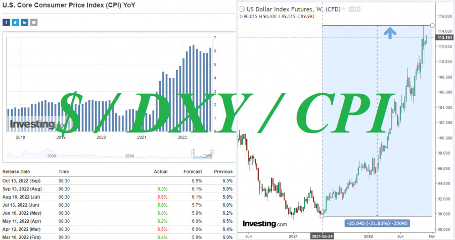 DXY: покупатели доллара ждут новых подтверждений своей правотыИнстаФорекс - Instaforex, 3 года назад Активность трейдеров на финансовых рынках в первой половине дня минимальна: участники рынка ждут публикации (в 12:30 GMT) свежих данных по инфляции в США. Как следует из опубликованных вчера протоколов с сентябрьского заседания ФРС, руководители американского центрального банка намерены «поддерживать более жесткую политику для достижения своей цели по снижению повышенной инфляции», которую «будет целесообразно сохранять его в течение определенного периода времени», «несмотря на замедление рынка труда». Теперь, по мнению экономистов, ФРС повысит ставку до 5,0% к концу первого квартала 2023 года, а к концу этого года она составит составить 4,50%, несмотря на рецессию, ожидаемую в США в первой половине 2023 года. Экономисты также считают, что ФРС, скорее всего, не станет также быстро снижать ключевую ставку «из-за упорно высокой инфляции», как минимум до конца 2023 года. Это – сильный фундаментальный фактор, который будет толкать доллар вверх, а его индекс DXY – в сторону более чем 20-летних максимумов вблизи отметок 120.00, 121.00 (об этом мы писали в нашем предыдущем обзоре «DXY: краткосрочный прогноз»). И вот, сегодня участники рынка хотят получить подтверждение их прогнозам относительно перспектив доллара. Как сообщили в Бюро трудовой статистики США в августе, потребительская инфляция вновь начала набирать обороты. Из отчета следует, что инфляция в США в августе выросла выше ожиданий: индекс потребительских цен (CPI) вышел со значением +8,3% (в годовом исчислении) против прогноза +8,1% и +8,5% в предыдущем месяце (в месячном выражении инфляция выросла на +0,1% с 0% в июле, что оказалось выше ожиданий о снижении на -0,1%). Сегодня же участники рынка ждут, что отчет Бюро трудовой статистики вновь укажет на рост инфляции в США в сентябре (подробнее о событиях предстоящей недели см. в Важнейшие экономические события недели 10.10.2022 – 16.10.2022). Ожидается, что базовая инфляция (без учета волатильных цен продовольственных товаров и энергоносителей) вновь выросла (в годовом выражении), до 6,5% (предыдущие значения: +0,6% (+6,3% в годовом выражении) в августе, +0,3% (+5,9% в годовом выражении) в июле, +0,7% (+5,9% в годовом выражении) в июне, +0,6% (+6,0% в годовом выражении) в мае, +0,6% (+6,2% в годовом выражении) в апреле, +0,3% (+6,5% в годовом выражении) в марте). При этом основной показатель CPI должен выйти со значением +8,1% (после роста до +8,3% в августе). Данные говорят, что инфляция в США еще остаётся на рекордно высоких уровнях. Это, в свою очередь, делает повышение ставки на 75 базисных пунктов на заседании FOMC на ноябрьском заседании теперь «практически гарантированным», говорят экономисты. Теперь, по их мнению, «устойчивое возвращение к 2% инфляции в настоящее время становится еще более отдаленным», и ФРС предстоит еще «долгий путь» по возращению инфляции к целевому уровню. А это значит, что возможно еще не одно повышение процентной ставки ФРС на 0,75% на каждом последующем заседании. Это – сильный бычий фактор для доллара. Конечно, есть одно «но» - если инфляция в США все же действительно не начнет замедляться. Теперь, если из США не будут поступать явно слабые другие важные макро данные до очередной публикации инфляционных индикаторов (в середине следующего месяца), то доллар будет пользоваться бычьим импульсом от сильн