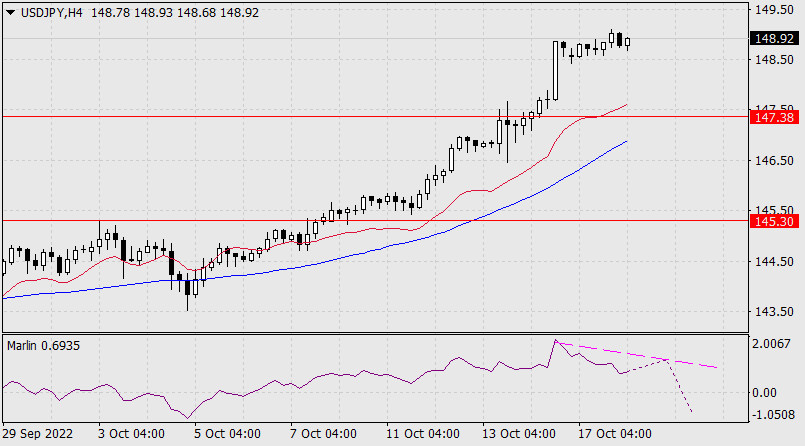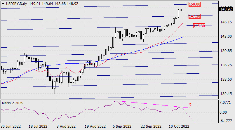 Прогноз по USD/JPY на 18 октября 2022 годаИнстаФорекс - Instaforex, 3 года назад Йена продолжает свой движение к целевому уровню 150.00, образованному линией ценового канала старшего (месячного) таймфрейма. С осциллятором Марлин уже почти сформирована дивергенция. Даже если дивергенция чуть усилится, у цены сохраняется возможность для отработки намеченной цели. В целом текущая техническая картина нам говорит об истощении потенциала роста пары USD/JPY.