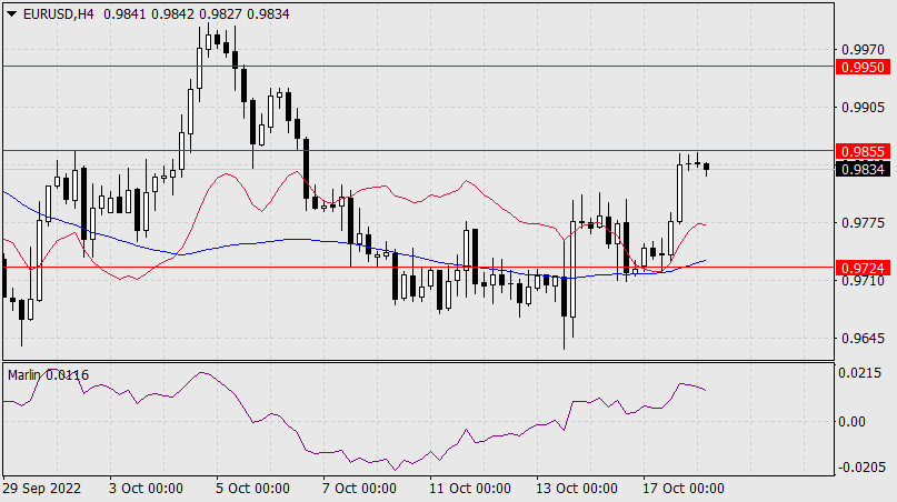 В своём росте цена почти достигла магнитную точку пересечения двух линий – целевого уровня 0.9855 и линии Крузенштерна дневного масштаба. Теперь у цены два действия на выбор: закрепиться над этим уровнем и продолжить рост к 0.9950, и развернуться вниз к точке старта вчерашнего дня – к уровню 0.9724. Осциллятор Марлин в положительной области, он тяготеет к продолжению роста. Сложность в выборе направления ещё и в том, что сейчас на рынке две противоборствующие инвестиционные идеи: продолжать покупки риска на позитивном фоне корпоративных отчётов и проявить в этом осторожность, потихоньку избавляясь от евро, так как на фоне продолжающих поступать негативных статистических данных по еврозоне, ЕЦБ на заседании 27 октября может повысить ставку не на 0,75%, а на 0,50%, что, конечно, отправит евро однозначно вниз.