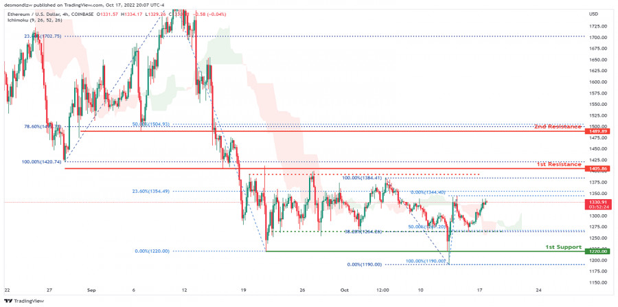 ETH/USD: формирование краткосрочного бычьего импульса. Прогноз на 18 октября 2022ИнстаФорекс - Instaforex, 3 года назад Как показывает 4-часовой график, пара ETH/USD торгуется в медвежьем тренде. Однако ночью цена закрылась выше облака Ишимоку, что указывает на краткосрочный бычий импульс. Ожидается, что цена направится к 1-му уровню сопротивления 1405.86, который соответствует 100% уровню коррекции Фибоначчи и предыдущему уровню свинг-лоу. Торговая рекомендация Вход: 1330.00 Условия для входа: немедленный вход в покупку после отскока от 1267.20, где пересекаются уровни коррекции Фибоначчи 38.2% и 50% Тейк-профит: 1489.89 Условия для фиксации прибыли: область сопротивления, где пересекаются уровни коррекции Фибоначчи 78.6% и 50% Стоп-лосс: 1190 Условия для активации ордера стоп-лосс: предыдущий лоу, уровни коррекции Фибоначчи 0% и 100% Материал предоставлен компанией InstaForex - www.instaforex.com |