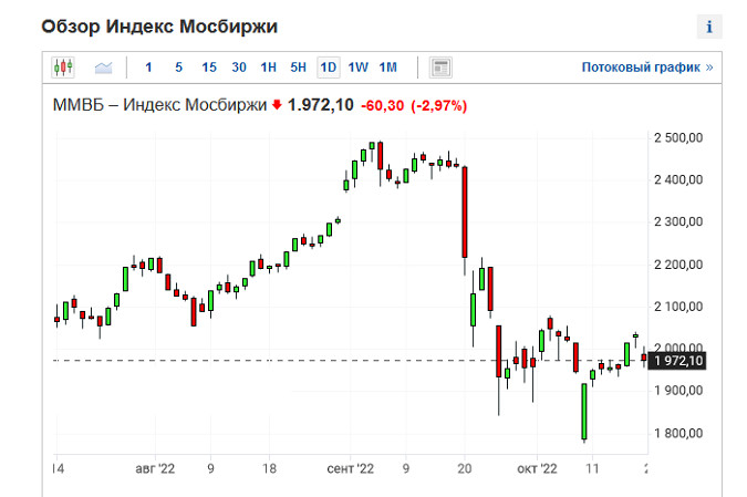 Индекс Московской биржи снижается на фоне объявления Путиным военного положения на части территорий.