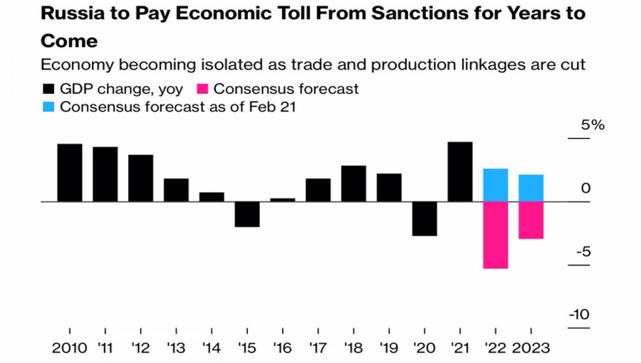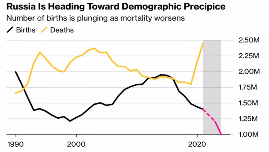 Тучи над рублем ходят хмуроИнстаФорекс - Instaforex, 3 года назад Демографический кризис и коллапс экономики. Такой представляется влияние частичной мобилизации в России экспертам Bloomberg. Впрочем, на исходе февраля они также думали о глубочайшей рецессии в экономике РФ и обвале рубля на фоне масштабных западных санкций. Рубль действительно изначально провалился, но затем восстал из пепла, а адаптация российской экономики к различного рода ограничениям позволила ей не упасть на колени. Действительно ли сейчас тучи над небом РФ настолько черны? 300 тыс. частично мобилизованных и 350 тыс. сбежавших из страны обернутся снижением рождаемости до 1,2 млн в 2023, что является самым низким показателем за всю постсоветскую историю России. Общее количество смертей составляет около 2 млн, хотя во время пандемии цифра подскакивала до 2,5 млн. Динамика рождаемости и смертности в России РФ и без частичной мобилизации испытывала нехватку рабочей силы. Проблема усугубляется, что негативно отражается на деловой активности и потребительских настроениях и в конечном итоге приведет к снижению благосостояния населения на 12%, согласно оценкам Банка России. По его мнению, нефтегазовый и высокотехнологический сектор еще не ощутили на себе влияние санкций в полной мере, а бегство иностранных компании с территории страны после 24 февраля взвинтило инфляцию, так как зарубежные аналоги местных товаров закончились. Нынче цены рискуют еще больше подрасти за счет увеличения зарплат со стороны борющихся за рабочую силу в условиях ее нехватки компаний. ЦБ РФ готов обновить прогнозы по ВВП на своем очередном заседании в конце октября, но утешительного в них ничего не будет. Динамика и прогнозы российского ВВП Стагфляционная среда в виде сочетания высокой инфляции и анемии в экономическом росте не сулит ничего хорошего национальной валюте. Как, впрочем, и двойной дефицит, бюджета и счета текущих операций, о котором мы говорили в предыдущем материале. Перспективы рубля начинают обретать выраженный «медвежий» оттенок, а неспособность USDRUB закрепиться выше отметки 65 стала результатом сомнений инвесторов, что Россию можно вытеснить с рынка нефти. Несмотря на то что морские перевозки черного золота в Китай, Индию и Турцию сократились на 350 тыс. б/с по сравнению с максимальной отметкой в 2,2 млн б/с, имевшей место летом, объемы нефти на танкерах, которым еще предстоит показать свое назначение, выросли на 450 тыс. б/с. Сомневаются инвесторы и в эффективности ценового потолка для российской нефти. Москва заявила, что не будет продавать тем государствам, которые его поддержат. И это решение не экономическое, а политическое. В надежде продавить ЕС. Однако если не получилось с газом, почему должно получиться с нефтью? Технически на дневном графике USDRUB не исключено формирование паттерна Расширяющийся клин. Правда, для этого пара должна для начала просесть ниже 55,9, а затем развернуться. В связи с этим работаем как в лонг на прорыве 62,3, так и в шорт в случае успешного штурма поддержки на 60,5. Материал предоставлен компанией InstaForex - www.instaforex.com |