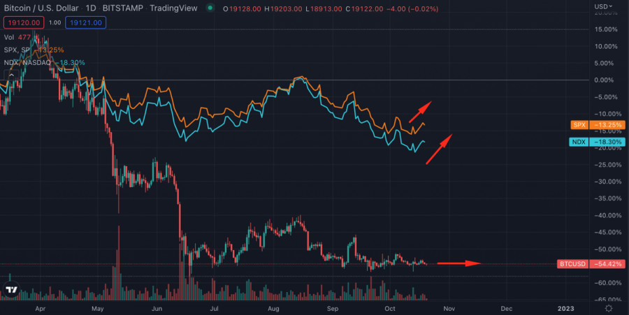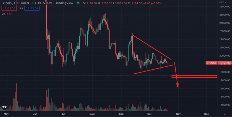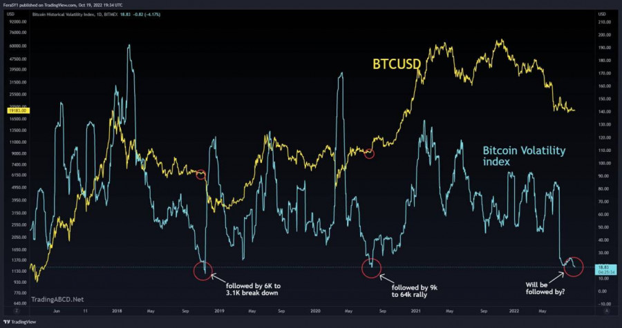 Биткоин вступает в новую фазу медвежьего рынка: стоит ли ждать обновления локального дна?ИнстаФорекс - Instaforex, 3 года назад Биткоин сохраняет прописку в узком диапазоне колебаний $19k-$20k. Актив усердно движется в рамках установленного коридора и не может его покинуть из-за низкой торговой активности. Рыночные настроения также постепенно падают, что может указывать на новую фазу медвежьего рынка BTC. Новая фаза медвежьего рынка BTCПосле публикации отчетности по инфляции стало понятно, что ожидать существенных изменений в монетарной политике ФРС не стоит. Члены ведомства категорично подтвердили свою приверженность количественному сокращению балансов. В итоге Биткоин замер вблизи уровня $19k на долгий месяц и продолжает торговаться вблизи данной отметки. При этом интерес покупателей к BTC значительно упал, что привело к падению уровня волатильности и ончейн-активности до показателей 2010 года. Падение уровня общей заинтересованности в Биткоине вызван отсутствием существенных инвестиций и развития актива. Одним из ключевых триггеров для инвесторов является уровень инфляции, который негативно влияет на все высокорисковые активы. Согласно последним данным, инфляционные ожидания среди мировых финансовых управляющих остается на рекордном с 2008 года уровне. Это означает, что рынки готовятся к долгосрочной борьбе с инфляцией. Следовательно, высокорисковые активы на долгий срок уходят из поля зрения инвесторов. Майнинг Bitcoin также продолжает создавать проблемы для отрасли. Несмотря на завершение массовой распродажи BTC майнинг-компаниями, энергопотребление криптовалюты выросло на 41% за 12 месяцев. При этом цена остается на низком уровне, что может спровоцировать регуляторов на жесткие действия или заявления. Евросоюз может заблокировать майнинг Биткоина в ближайшее время из-за существенных проблем с электроэнергией в регионе. Вряд ли это негативно скажется на Биткоине в его текущих кондициях, но потенциально это указывает на еще одну проблему, которая помешает BTC начать затяжной рост. Позитивные сигналыНесмотря на обилие негативных сигналов и подготовку рынков к сложной зиме, продолжает активное накопление монет BTC. Количество адресов с балансами 10-100 BTC и 10 000-100 000 достигло максимума с февраля 2021 года. При этом около 66% ходлеров не перемещали свои Bitcoins более года. В отчете компании Tesla также говорится о том, что компания сохранила 10 800 BTC в третьем квартале. Эти факты свидетельствуют о том, что процесс оздоровления актива и перехода монет BTC в руки долгосрочной аудитории продолжается. Следовательно, фундаментальной ценности Биткоин не потерял. Что будет с BTC/USD в ближайшее время?Вероятней всего мы увидим дальнейшие боковик криптовалюты с последующим импульсным движением вверх. Биткоин движется в диапазоне $19k-$20k более месяца, и за этот период на границах коридора появились большие пласты ликвидности. Учитывая, что последние несколько недель социальные настроения указывают на падение, стоит ожидать роста с выбиванием шортов. Впоследствии цена продолжит углубление ниже $18k и обновит локальное дно, где собраны большие объемы ликвидности. При этом есть вариант, когда цена BTC сразу отправится на ретест локального дна. Это видно по текущей вялой реакции актива на "оттепель" фондовых рынков. У BTC нет сил для восходящего движения за SPX и другим