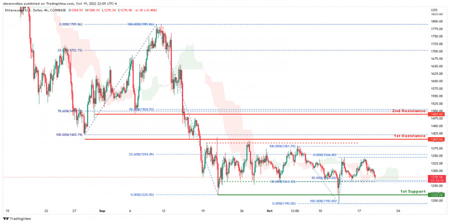 ETH/USD продолжает консолидацию в диапазоне. Прогноз на 20 октября 2022ИнстаФорекс - Instaforex, 3 года назад На 4-часовом графике пара ETH/USD торгуется в медвежьем тренде. В течение последнего месяца цена консолидировалась между 1-м уровнем сопротивления 1405.86 и 1-м уровнем поддержки 1405.86. Ожидается, что цена продолжит консолидацию в этой области без явного движения в определенном направлении. Торговая рекомендация Вход: 1345.17. Условия для входа: после отскока от 1267.20, где пересекаются уровни коррекции Фибоначчи 38.2% и 50%, поместите бай-стоп выше уровня 1344, соответствующего уровню коррекции Фибоначчи 0%. Тейк-профит: 1489.89. Условия для фиксации прибыли: область сопротивления, где пересекаются уровни коррекции Фибоначчи 78.6% и 50%. Стоп-лосс: 1190. Условия для активации ордера стоп-лосс: предыдущий лоу, уровни коррекции Фибоначчи 0% и 100%. Материал предоставлен компанией InstaForex - www.instaforex.com |