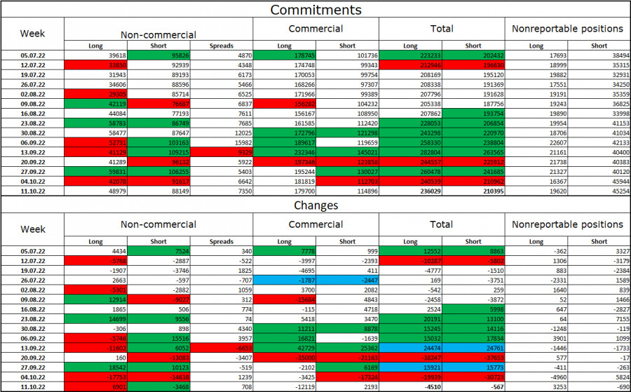 Добрый день, уважаемые трейдеры! На часовом графике пара GBP/USD выполнила новый разворот в пользу доллара США и падение к восходящей трендовой линии. Отбой от этой линии сработает в пользу британца и возобновления роста в направлении уровня 1,1480. Закрытие под линией повысит вероятность продолжения падения в направлении уровней 1,1150 и 1,1000. Вчера в Великобритании вышел очередной отчет по инфляции, который показал очередное ускорение роста цен. Этот факт совершенно никого не удивил, так как инфляция в Британии не просто растет, она не подает никаких признаков своего замедления. Таким образом, никто даже не обратил внимания на то, что в прошлом месяце она немного замедлилась, трейдеры сразу же посчитали, что это лишь «погрешность». В случае с Банком Англии ситуация примерно такая же, как и с ЕЦБ. Растущая инфляция должна заставить британский регулятор продолжать повышать ставку, но для фунта стерлингов эта информация не несет в себе ничего полезного. Ставка в Британии растет с самого начала года, а британец все это время усиленно падает. В данное время не существует взаимосвязи между понятиями «рост инфляции» - «повышение ставки» - «укрепление валюты». Также отмечу, что последние потрясения, связанные с планами Лиз Трасс понизить налоги, которые вызвали обвалы на финансовых рынках, остались позади. Трейдеры не могут вечно находится под впечатлением одного этого фактора. Сейчас потихоньку начинают набирать значение два следующих заседания ФРС и Банка Англии. ФРС потихоньку приближается к тому уровню ставки, который будет финальным. Возможно, еще 2-3 месяца и ставка в США перестанет расти. После того как это случится, британец получит возможность показать рост, но в ближайшие 2-3 месяца шансы на его падение будут оставаться выше. На 4-часовом графике пара выполнила новое закрытие над нисходящим трендовым коридором. Это уже второе закрепление, что значительно повышает вероятность роста британца в направлении хотя бы 1,1496. Тем не менее «медвежья» дивергенция у индикатора CCI сработала в пользу американской валюты и началось новое падение в направлении уровня Фибо 200,0% - 1,1111. В целом, графическая картина 4-часового графика не дает однозначный отчет на вопрос, что будет дальше с фунтом. Отчет Commitments of Traders (COT):