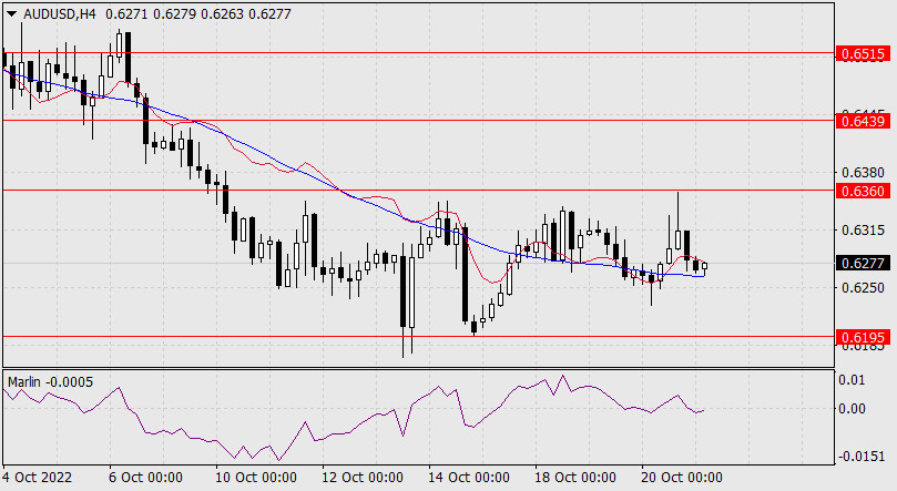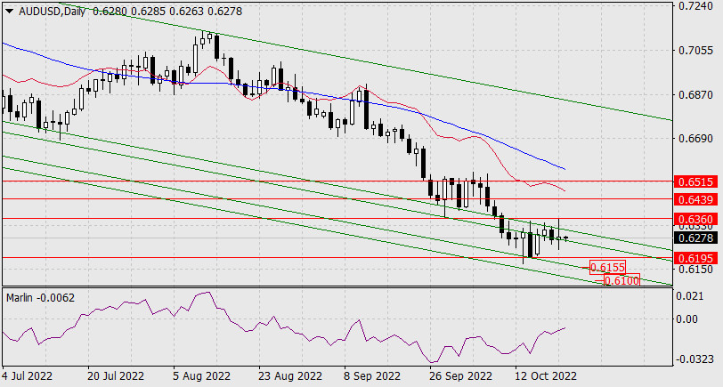 Прогноз по AUD/USD на 21 октября 2022 годаИнстаФорекс - Instaforex, 3 года назад В четверг, как и европейские валюты, австралийский доллар провёл в широком диапазоне, после чего наметил продавливание технических поддержек. На дневном графике таковой поддержкой является вложенная линия ценового нисходящего канала. Преодоление её (уход под 0.6260) открывает цель по уровню 0.6195, под ним находится другая линия ценового канала, которую цена сможет отработать примерно на отметке 0.6155. Осциллятор Марлин пока сопротивляется такому плану и растёт против цены, что может замедлить «австралийца» и упрочить его по отношению к европейским валютам в краткосрочной перспективе.