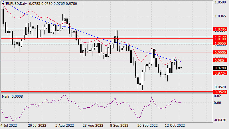 Прогноз по EUR/USD на 21 октября 2022 годаИнстаФорекс - Instaforex, 3 года назад Евровые «быки» не захотели вчера легко сдаваться – диапазон торговли составил 92 пункта и день закрылся белой свечкой в 15 пунктов. С технической стороны цена воспользовалась замешательством осциллятора Марлин на нулевой нейтральной линии. Но уже в тихоокеанскую сессию вчерашний рост был перекрыт, цена вновь устремилась к ближайшей поддержке 0.9724, осциллятор Марлин продавливает поддержку этой нулевой линии. Уход цены под 0.9724 открывает цель 0.9520.