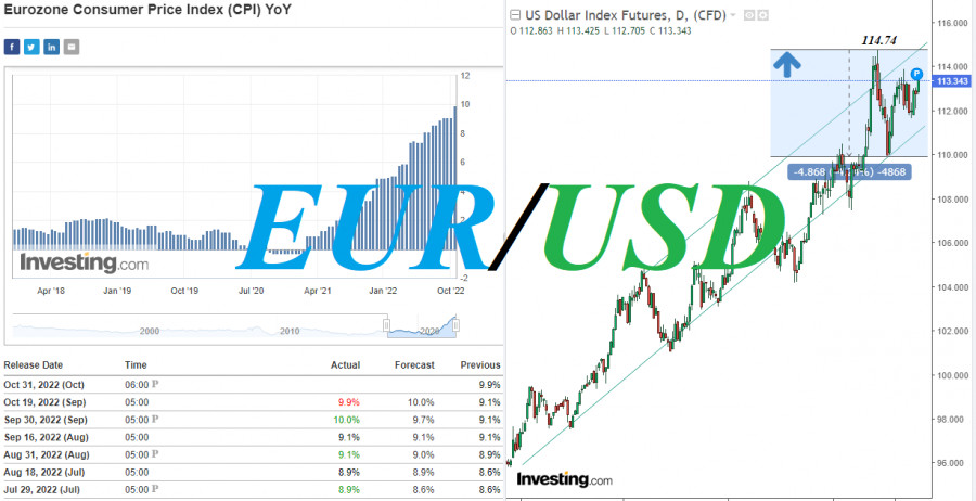 EUR/USD: накануне заседания ЕЦБИнстаФорекс - Instaforex, 3 года назад Пара USD/JPY штурмует отметку 151.00 (об этом мы писали в нашем предыдущем обзоре), золото падает в цене, а доллар продолжает наступать. На момент публикации данной статьи индекс доллара DXY находится вблизи отметки 113.34, оставаясь в верхней части диапазона, образовавшегося между локальными уровнями поддержки и сопротивления 114.74 и 109.96. При этом общая восходящая динамика доллара сохраняется, толкая индекс DXY в сторону более чем 20-летних максимумов вблизи отметок 120.00, 121.00. Пробой локальных круглых уровней сопротивления 114.00, 115.00 станет сигналом, говорящим о возвращении индекса DXY к росту. Вчера доллар получил поддержку от статистики по рынку труда: в своём еженедельном отчёте Министерство труда США сообщило о снижении числа первичных заявок на получение пособия по безработице (за неделю на 14 октября) до 214,0 тыс. (с 226,0 тыс. неделей ранее), что лучше ожиданий экономистов о росте показателя до 230,0 тыс. Состояние рынка труда (вместе с данными по ВВП и уровню инфляции) является ключевым индикатором для ФРС при определении параметров ее кредитно-денежной политики. Падение показателя (число первичных и вторичных заявок на пособия по безработице) и его низкое значение является признаком восстановления рынка труда и оказывает краткосрочное позитивное влияние на USD. На сегодня публикации важной макро статистики по США не запланировано. Она появится на следующей неделе (подробнее см. в Важнейшие экономические события недели 24.10.2022 – 30.10.2022). Также на следующей неделе состоятся заседания сразу трех крупнейших мировых центральных банков: Японии, Канады, Еврозоны. Что касается последнего, то его руководители, в целом, настроены на очередное повышение процентных ставок. Как ожидается, на заседании в четверг руководители ЕЦБ вновь поднимут уровень ключевых процентных ставок, на 0,50% или даже на 0,75%. Согласно окончательной оценке, годовая инфляция в Еврозоне в сентябре составила 9,9% (ниже первой оценки в 10,0%). Базовый годовой CPI вырос на +4,8%, что соответствует прогнозу и предыдущим 4,8%. Согласно Евростату, годовая инфляция снизилась в шести государствах-членах блока, осталась стабильной в одном и выросла в двадцати. Недавний опрос СМИ экономистов показал, что они ожидают от ЕЦБ очередного повышения ставок по депозитам и рефинансированию на 75 базисных пунктов (по депозитам до 1,50% и ставку рефинансирования до 2,00%) на заседании 27 октября, чтобы сдержать инфляцию, превышающую целевой уровень в пять раз. По прогнозам, к концу года ставки по депозитам и рефинансирования составят 2,00% и 2,50%, соответственно. В то же время ЕЦБ находится в непростой ситуации, т.к. экономике Еврозоны грозит рецессия, с вероятностью ее наступления в течение года, причём характер рецессии может быть глубоким и длительным, учитывая военный конфликт на Украине и неразбериху на европейском рынке энергоносителей. Несмотря на поступившую информацию с прошедшего накануне саммита лидеров ЕС, на котором «удалось достигнуть общего соглашения в области энергетической безопасности» с перспективой создания картеля европейских покупателей газа, который будет заниматься закупками и последующим распределением, дефицит газа и нефти в Европе будет и далее раскручивать инфляцию. Сможет ли с ней справиться ЕЦБ, двигающийся пока что осторожны