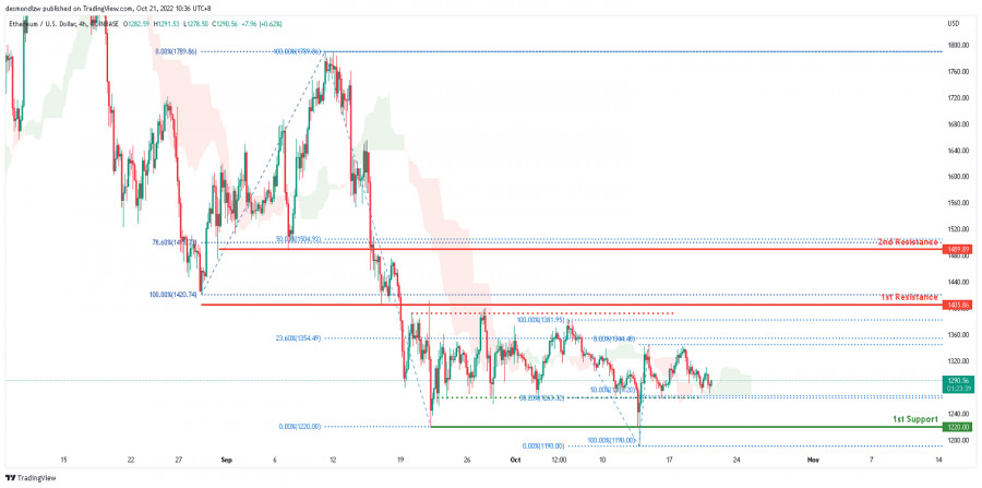 ETH/USD: консолидация в диапазоне продолжается. Прогноз на 21 октября 2022ИнстаФорекс - Instaforex, 3 года назад На 4-часовом графике пара ETH/USD торгуется в медвежьем тренде. В течение последнего месяца цена консолидировалась между 1-м уровнем сопротивления 1405.86 и 1-м уровнем поддержки 1405.86. Ожидается, что в ближайшее время цена будет консолидироваться в этой области без явного движения в определенном направлении. Торговая рекомендация Вход: 1345.17. Условия для входа: после отскока от 1267.20, в области пересечения уровней коррекции Фибоначчи 38.2% и 50%, поместите стоп ордер на покупку выше уровня 1344, где расположен уровень коррекции Фибоначчи 0%. Тейк-профит: 1489.89. Условия для фиксации прибыли: область сопротивления, где пересекаются уровни коррекции Фибоначчи 78.6% и 50%. Стоп-лосс: 1190. Условия для активации ордера стоп-лосс: предыдущий лоу, уровни коррекции Фибоначчи 0% и 100%. Материал предоставлен компанией InstaForex - www.instaforex.com |