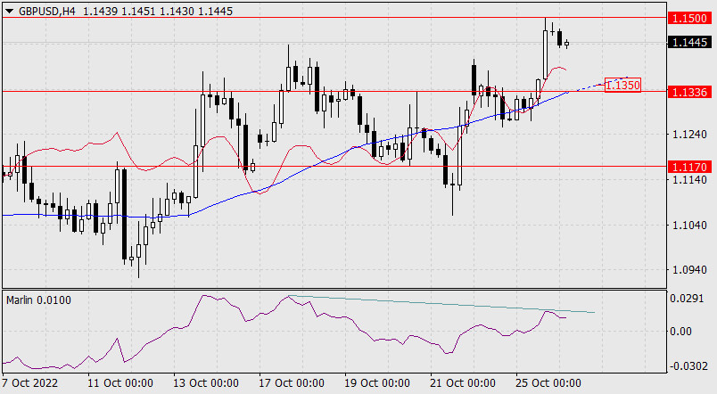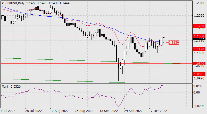 Прогноз по GBP/USD на 26 октября 2022 годаИнстаФорекс - Instaforex, 3 года назад Вчера, вместе с остальным рынком, фунт стерлингов подрос. Был отработан целевой уровень 1.1500 (с учётом флуктуации), сегодня утром наблюдается откат от сопротивления. Закрепление цены над 1.1500 открывает дорогу к дальнейшему росту с первой целью 1.1760. Возврат цены под линию Крузенштерна дневного масштаба (1.1336) вернёт фунт к позициям 20 октября, к поддержке 1.1170, уход под которую открывает цель по линии ценового канала 1.0800.