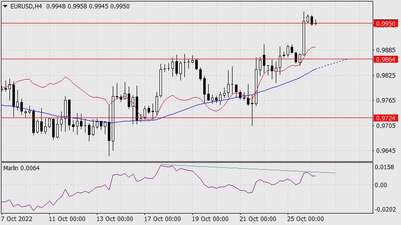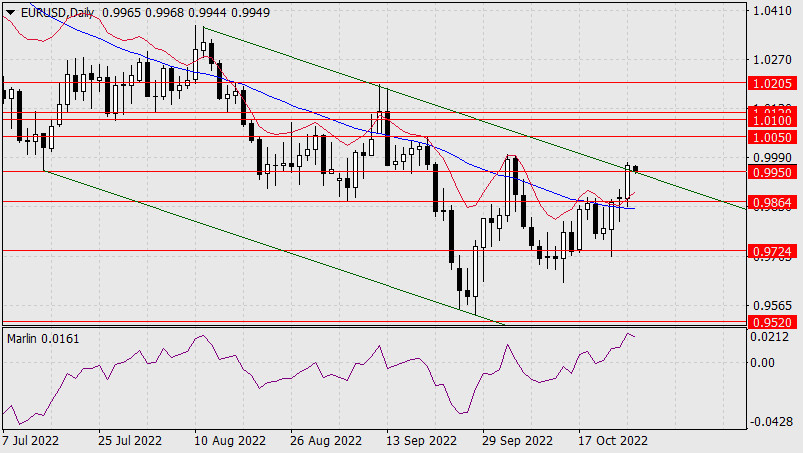 Прогноз по EUR/USD на 26 октября 2022 годаИнстаФорекс - Instaforex, 3 года назад Во вторник евро продолжил рост и поставил для решения новые задачи: состоится ли закрепление цены над преодолёнными сопротивлениями, это уровень 0.9950 и верхняя линия ценового канала и продолжит рост к 1.0050, или же вернётся с закреплением под уровень 0.9950 и далее продолжит спуск к 0.9864 и 0.9724?