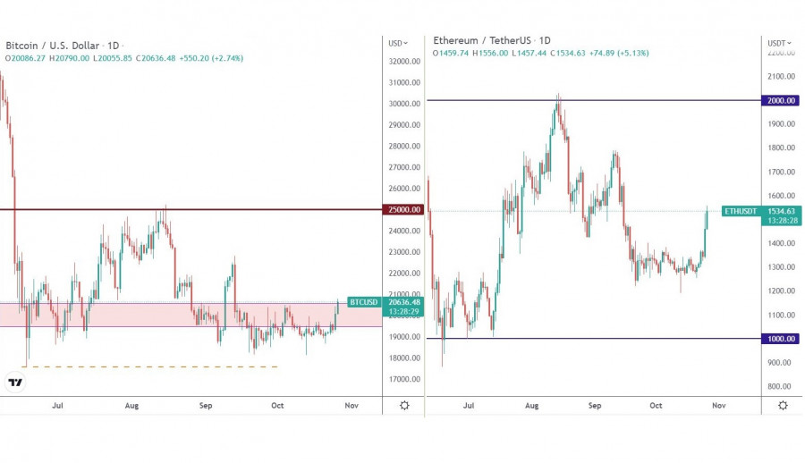 Криптовалютный рынок подает положительные сигналы к ростуИнстаФорекс - Instaforex, 3 года назад Приветствую криптохомячков и бывалых криптоэнтузиастов! Неужели мы дождались полноценного uptrend либо это очередная бычья ловушка - постараемся разобрать этот непростой вопрос. Практически весь октябрь Bitcoin и Ethereum двигались по характерной боковой амплитуде, что стало некой предпосылкой, что на рынке, возможно, имеет место смена торговых интересов. Стоит отметить, что в тот же период времени американские фондовые индексы по началу проявляли активный нисходящий настрой, что привело к обновлениям локальных минимумов нисходящего цикла от середины августа. В данном случае имеет место интересный феномен, что криптовалюты снижались медленнее фондового рынка. Не стоит преждевременно радоваться, криптовалюты попусту обвалились раннее в период августа и сентября. Смена торговых интересов Тут дела обстоят таким образом, фондовые индексы США замедлили спад примерно 12-13 октября, после чего возник характерный разворот. Вследствие чего средний рост индекса от локального минимума составил около 10%. В данном случае, более рискованные активы, в нашем случае – криптовалюты, сыграли с запозданием примерно на 1 неделю. Детали роста BTC и ETH разберем немного позже. В чем причина смены торговых интересов? В большей степени это связано с надеждами инвесторов касательно того, что ФРС на предстоящем заседание, 2 ноября, подаст рынку положительные сигналы о том, что они замедлят темп повышения ставки рефинансирования. Также все чаще среди экономических экспертов ходит предположение, что регуляторы недолго продержатся без печатного станка. Возможно, уже в 2023 году мы вновь увидим программу количественного смягчения. Что происходит на торговых графиках Bitcoin и Ethereum? Общая картина рынка: • 130 дней без обновления минимума нисходящего тренда BTC и ETH • 348 дней глобальному нисходящему тренду на криптовалютном рынке • 14% роста по BTC от локального минимума 13 октября • 30% роста по ETH от локального минимума 13 октября • +13 пунктов прибавил Crypto Fear & Greed Index от относительного застоя в октябре • +$113 млрд к капитализации от локального минимума 13 октября Детали роста Bitcoin Несмотря на то, что нисходящий настрой завершился в районе 13 октября, это значение $18 130, основное восходящее движение возникло лишь с 25 октября. В этот день первая криптовалюта укрепилась в стоимости на 3,9%, задав ритм для покупателей. В период 26 октября восходящий цикл был пролонгирован на новые уровни, вследствие чего застой октября завершил свое формирование, а котировка вновь оказалась выше психологической отметки $20 000. Станет ли этот локальный uptrend сигналом завершения нисходящего тренда – покажет время. Пока такие выводы делать рано, напомню, что еще в средине августа котировка уже подавала надежды на смену тренда, но все завершилось не лучшим образом. Сейчас стоит внимательно следить за денежно-кредитной политикой ведущих экономик, так как именно они укажут на последующий путь финансовых рынков. Детали роста Ethereum Вторая по величине криптовалюта Ethereum имела аналогичные циклы. 13 октября был обозначен локальный минимум октября $1 190, а 25 октября возник основной скачек активности длинных позиций. Вследствие чего котировка ETH укрепилась в стоимости лишь за 1 день на 8,64%. После рост продолжился, где застой октябр