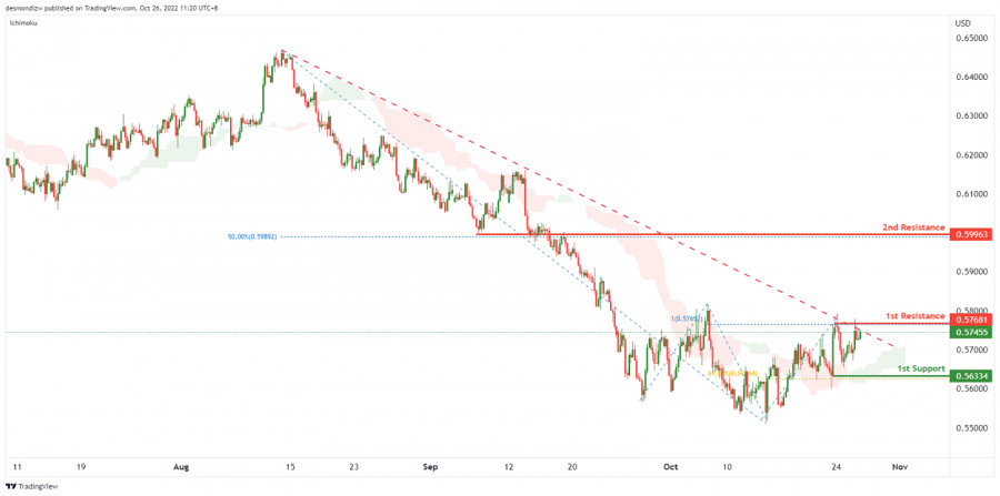 NZD/USD: ожидается формирование бычьего импульса. Прогноз на 26 октября 2022ИнстаФорекс - Instaforex, 3 года назад На 4-часовом графике пара NZD/USD тестирует нисходящую линию тренда и находится выше облака Ишимоку, что указывает на бычий импульс. Ожидается, что цена может вырасти до 1-го уровня сопротивления 0.58022, соответствующего 100% проекции Фибоначчи и предыдущему уровню свинг-хай. Если 1-й уровень сопротивления будет пробит, цена направится ко 2-му уровню сопротивления 0.59963, который соответствует перекрытию, выступающему в качестве сопротивления, и 50% уровню коррекции Фибоначчи. В качестве альтернативы цена может упасть до 1-го уровня поддержки 0.56334, соответствующего предыдущему уровню свинг-лоу и 61.8% уровню коррекции Фибоначчи. Торговая рекомендация Вход: 0.58022. Условия для входа: 100% проекция Фибоначчи и предыдущий уровень свинг-хай. Тейк-профит: 0.59963. Условия для фиксации прибыли: перекрытие, выступающее в качестве сопротивления, и 50% уровень коррекции Фибоначчи. Стоп-лосс: 0.56334. Условия для активации ордера стоп-лосс: предыдущий уровень свинг-лоу и 61.8% уровень коррекции Фибоначчи. Материал предоставлен компанией InstaForex - www.instaforex.com |