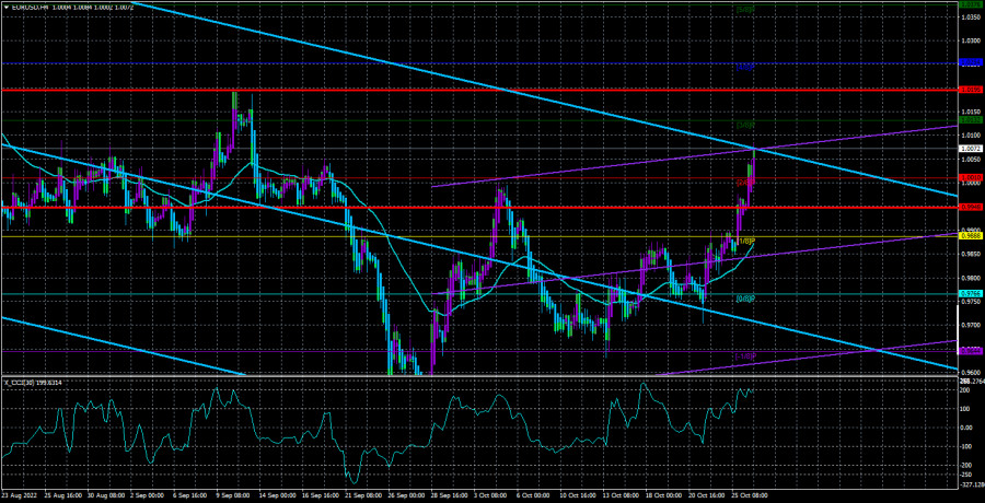Обзор пары EUR/USD. 27 октября. Безосновательный рост евровалюты, как повод задуматься.ИнстаФорекс - Instaforex, 3 года назад Валютная пара EUR/USD резко воспряла духом и только на этой неделе прибавила больше 200 пунктов. На самом деле от 20-летнего минимума пара отошла всего лишь на 450 пунктов, то есть именно настолько, насколько она отходила после каждого нового падения в рамках долгосрочного нисходящего тренда. Мы опять увидели стандартную коррекцию, после чего вполне может возобновиться падение котировок. Один из важных моментов, на который мы регулярно обращали внимание трейдеров, это неспособность обновить свои последние максимумы. Вчера это случилось - цена выросла сильнее, чем 4 октября(последний хай цены). Однако мы задаемся также вопросом, а на основании чего европейская валюта вообще росла на этой неделе, если макроэкономической статистики не было практически никакой, фундаментальный фон остается неизменным, геополитическая ситуация не улучшается? Мы считаем, что текущее укрепление евровалюты в некотором роде случайность. Случаются иногда моменты, когда пара движется в определенную сторону, но никто не может объяснить почему. Напомним, что рынок не обязан стоять на одном месте, если нет новых данных, отчетов или важных событий. Поэтому мы сейчас наблюдаем чисто технический рост пары, который даже немного логичен, если принять во внимание тот факт, что евро падал почти 2 года. Однако уже в ближайшее время на 24-часовом ТФ цена может столкнуться с линией Сенкоу Спан Б, которая может оказать сильное сопротивление. Если взглянуть на дневной ТФ, то вам будет даже очень сложно различить текущее движение, которое на 4-часовом ТФ выглядит весьма внушительно. Таким образом, еще рано открывать шампанское по поводу завершения нисходящего тренда. 450 пунктов вверх в не самом быстром темпе – это явно не повод считать тренд завершенным. Заседание ЕЦБ спровоцирует еще больший рост евро?Давайте будем честны и откровенны. Банк Англии семь раз повысил ключевую ставку, что не помешало фунту продолжать падение против доллара. ЕЦБ повысил ставку два раза, но не на 0,25%, а на 0,5% и 0,75%, что само по себе является очень «ястребиной» мерой. Тем не менее, европейская валюта тоже продолжала падать, а трейдерам были важны решения и риторика представителей ФРС, а не какого-то там европейского ЦБ. Сегодня будут оглашены результаты предпоследнего заседания в этом году. Ставка практически гарантированно вырастет еще на 0,75%. Но как это сопоставить с тем фактом, что европейская валюта большую часть недели уже росла? То есть евро рос в понедельник, вторник и среду, а затем еще сильнее вырастет в четверг, когда для этого действительно будут основания? При чем аналогичные основания ранее для трейдеров не были веской причиной покупать евро, а тут вдруг ни с того, ни с сего рынок ринется покупать ту валюту, от которой избавлялся в последние два года? Мы считаем, что такой вариант маловероятен. Уже давно известно, что ЕЦБ не сможет повышать ставку также сильно, как ФРС. А это значит, что ставка в Евросоюзе все равно останется ниже, чем в США, в долгосрочной перспективе. Одного только этого фактора хватает для того, чтобы евро не продолжал рост, так как денежные и инвестиционные потоки все равно будут предпочитать Америку Европе. Банальный пример: более высокая ставка ФРС - более вы