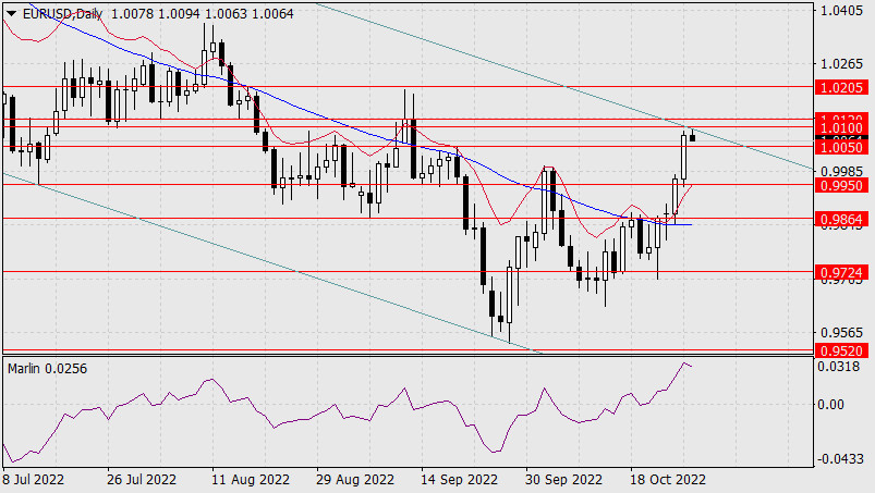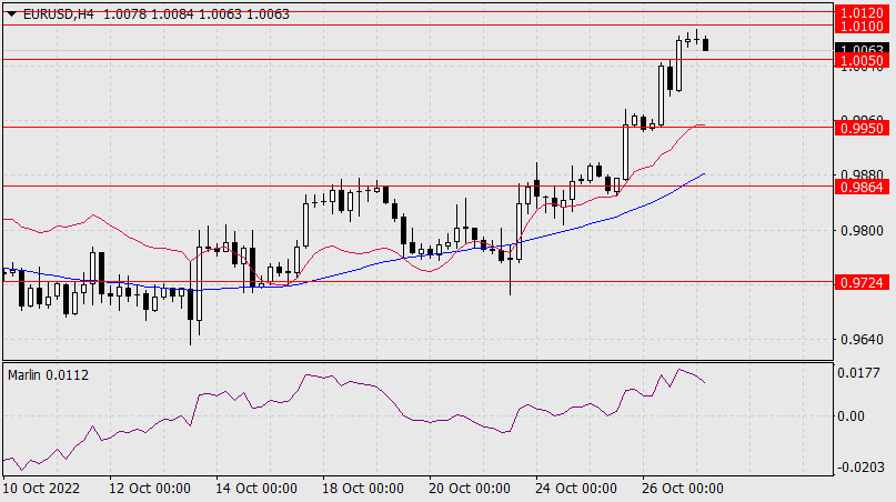 Прогноз по EUR/USD на 27 октября 2022 годаИнстаФорекс - Instaforex, 3 года назад Евро не унимается и вчера подрос ещё на 113 пунктов до целевого диапазона 1.0100/20. И в очередной раз рынком ставится вопрос – будет ли сегодня разворот по причине «мягкого» заявления ЕЦБ после повышения ставки на 0,75% и ожидающемся росте ВВП США за 3-й квартал на 2,4%, что будет означать завершение рецессии?