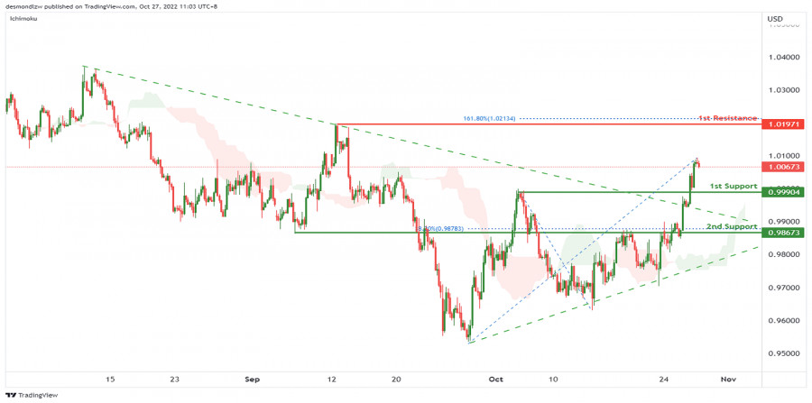 EUR/USD развивает бычий импульс. Прогноз на 27 октября 2022ИнстаФорекс - Instaforex, 3 года назад На 4-часовом графике пара EUR/USD движется вдоль краткосрочной восходящей линии тренда и пробивает долгосрочную нисходящую линию тренда, что указывает на бычий импульс. Ожидается, что цена может подняться до 1-го уровня сопротивления 1.01971, соответствующего предыдущему уровню свинг-хай и уровню расширения Фибоначчи 161.8%. В качестве альтернативы цена может упасть до 1-го уровня поддержки 0.99904, который соответствует предыдущему уровню свинг-хай. Если 1-й уровень поддержки будет пробит, цена направится ко 2-му уровню поддержки 0.98673, который соответствует 38.2% уровню коррекции Фибоначчи и перекрытию, выступающему в качестве поддержки. Торговая рекомендация Вход: 0.99904. Условия для входа: предыдущий уровень свинг-хай. Тейк-профит: 1.01971. Условия для фиксации прибыли: уровень свинг-хай и уровень расширения Фибоначчи 161.8%. Стоп-лосс: 0.98673. Условия для активации ордера стоп-лосс: 38.2% уровень коррекции Фибоначчи и перекрытие, выступающее в роли поддержки. Материал предоставлен компанией InstaForex - www.instaforex.com |