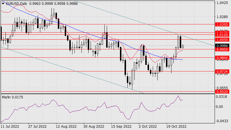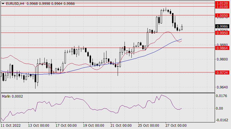 С повышением ставки ЕЦБ на 0,75% и с выходом хороших данных по американскому ВВП за 3-й квартал евро обвалился более чем на фигуру, перекрыв рост предшествующего дня. Рост американского ВВП составил 2,6% г/г против ожидания 2,4%, и этот фактор подтверждает посыл ФРС о том, что темп повышения ставки может быть уменьшен. Риторика Лагард не была «мягкой» (чего ожидалось), скорее, просто нейтральной.