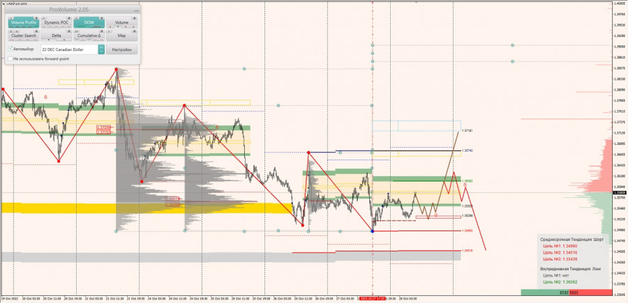 Среднесрочная тенденция: в шорт. Максимальное скопление объемов среднесрочной тенденции расположено в диапазоне по котировкам 1.37152-1.37259. В настоящий момент по паре совершаются инвестиционные операции ниже, указывая на силу продавцов. Объемы последнего импульса по котировкам 1.35550-1.35673, и в настоящий момент пара торгуется выше, что указывает на слабость покупателей. Также наблюдаем внутридневной лонговый импульс, и именно внутри одного дня можно поработать в лонг, a далее только работать по идеям среднесрочной тенденции.