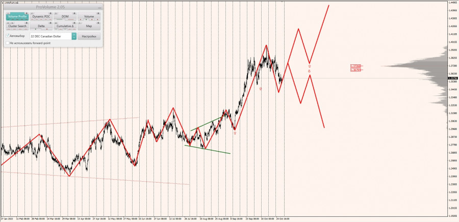 Долгосрочная тенденция: в лонг. Максимальное скопление объемов текущего контракта расположено в диапазоне по котировкам 1.36794-1.37268. В настоящий момент по паре совершаются инвестиционные операции ниже, указывая на слабость покупателей.