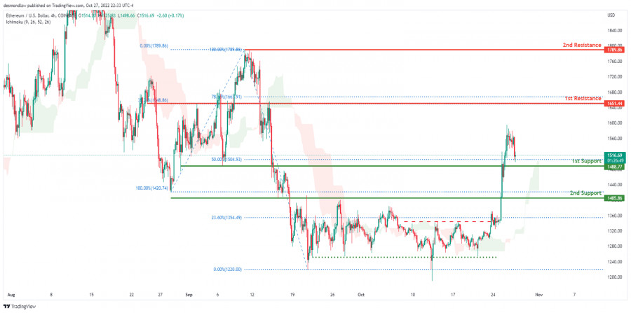 ETH/USD: ожидается усиление бычьего импульса. Прогноз на 28 октября 2022 годаИнстаФорекс - Instaforex, 3 года назад На 4-часовом графике пара ETH/USD торгуется в бычьем тренде. Цена получила нисходящий медвежий импульс к 1-уровню поддержки 1488.77, соответствующему уровням коррекции Фибоначчи 78.5% и 50%. Однако если бычий импульс сохранится, ожидается, что цена продолжит движение к 1-му уровню сопротивления 1651.44, где расположены уровни коррекции Фибоначчи 78.6% и 38.2%. Торговая рекомендация Вход: 1488.77 Условие для входа: Вход на покупку в области, где расположены 1-й уровень поддержки и уровни коррекции Фибоначчи 50%. Тейк-профит: 1651.44 Условия для фиксации прибыли: Следующий уровень сопротивления и где расположены уровни коррекции Фибоначчи 78.6% и 38.2%. Стоп-лосс: 1405.86 Условия для активации ордера стоп-лосс: 2-й уровень поддержки и немного ниже предыдущего уровня свинг-лоу. |