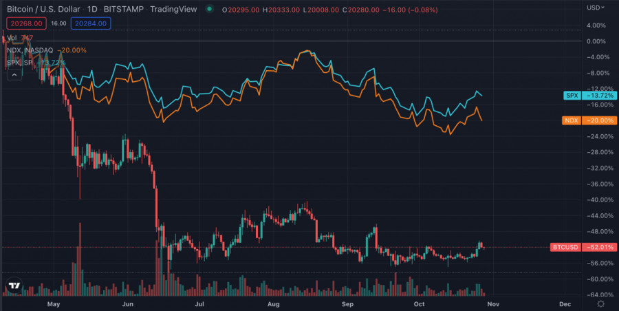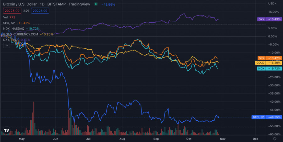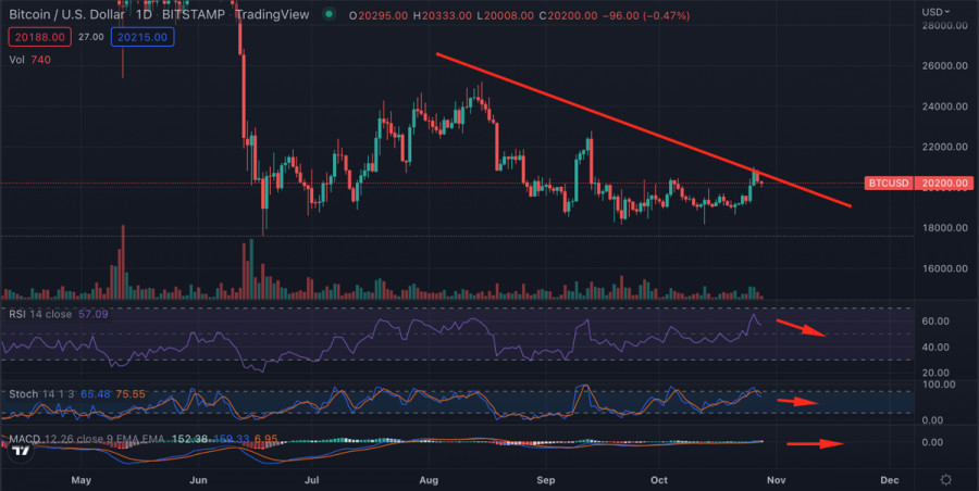Биткоин скорректировался на фоне отчетности американских компаний: чего ждать от криптовалюты дальше?ИнстаФорекс - Instaforex, 3 года назад По итогам последних двух дней Биткоин вырос на 10%, а эфириум на 20%. Восходящее движение флагманов криптовалютного рынка сопровождалось повышенной волатильностью и ростом объемов торгов. Причиной восходящего движения криптовалют послужила коррекция индекса доллара США, который снизился до сильного уровня поддержки. Пиковый момент покупательской активности на рынке акций также внес свой вклад в бычье движение криптовалют. Биткоину удалось сломить уровень нисходящего тренда пробив отметку $20,4k. Впоследствии актив достиг уровня $20,7k, где встретил ожесточенное сопротивление продавцов. Несмотря на это, основная цель была достигнута – объемы ликвидированных коротких позиций достигли $1,3 миллиарда. Что с Биткоином сейчас?По состоянию на 28 октября криптовалюта откатилась до локального уровня поддержки $20,1k. Биткоин откатился за жизненно важный уровень $20,4k, а потому дальнейшее восходящее движение актива находится под вопросом. Объемы торгов и волатильность BTC также вернулись в норму, намекая на завершение восходящего турне. Ключевой причиной снижения покупательской активности на крипторынке послужила общая пессимистическая атмосфера на рынке после публикации отчетности компаний FAAMG (Facebook, Amazon, Google, Apple, Microsoft). Главным поставщиком негатива на рынок стала отчетность Facebook, акции которой в моменте падали на 20%. Анализ BTC/USDВ результате неутешительной отчетности фондовые индексы пошли на коррекцию и потянули за собой крипторынок. Ситуация вокруг Биткоина напряженная, так как активу нужно в кратчайшие сроки закрепляться выше $20,4k, чтобы продолжать движение к $22k-$23k. Технические метрики единогласно указывают на смену внутридневной динамики на медвежью. Объемы покупательской активности падают, а давление со стороны фондовых индексов усиливается. Учитывая это главной задачей BTC на выходных станет удержание круглой отметки $20k, чтобы сохранить возможность продолжать восходящее движение. Импульсов для роста на будущей неделе будет предостаточно. С одной стороны мы видим позитивную динамику ВВП США (2,6% при ожидании 2,4%). В то же время рынки готовятся к повышению ключевой ставки на 75 б.п. второго ноября. До выборов в Сенат также остается чуть больше двух недель. ИтогиУчитывая ситуацию на фондовом рынке, главной задачей Биткоина остается сохранение уровня $20k. При удержании данного рубежа речь о смене локального тренда не идет, и восходящее движение может быть продолжено на следующей неделе. Поэтому Биткоину необходимо сохранить важный уровень поддержки при снижении объемов торгов и активности на рынке на выходных. При медвежьем сценарии, Bitcoin вернется в привычный диапазон и постепенно перейдет к попыткам снятия ликвидности ниже $17,6k. Материал предоставлен компанией InstaForex - www.instaforex.com |