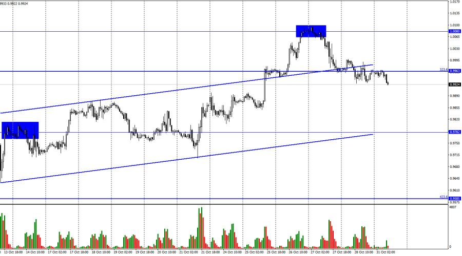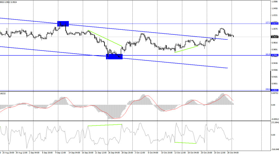 EUR/USD. 31 октября. Трейдеры ждут европейских данных по ВВП и инфляцииИнстаФорекс - Instaforex, 3 года назад Добрый день, уважаемые трейдеры! Пара EUR/USD в пятницу продолжала процесс падения и выполнила закрепление под уровнем коррекции 323,6% - 0,9963. Таким образом, падение котировок может быть продолжено в направлении следующего уровня 0,9782, который все еще находится в пределах восходящего трендового коридора. Настроение трейдеров сохраняется «бычьим». На этой неделе для пары евро-доллар будет очень сильный информационный фон, поэтому готовьтесь к сильным движениям и высокой активности. Начинается неделя не скучно, как часто бывает, а с отчетов по ВВП и инфляции в еврозоне. Эти отчеты станут доступными через час, но трейдеры с самого утра избавляются от европейской валюты, явно ожидая плохих данных. Следует отметить, что в последние три квартала европейская экономика показывал неплохие темпы роста. Однако по итогам третьего квартала этот показатель может замедлиться до 0,2% кв/кв. Похоже, что именно этот факт и напрягает трейдеров, потому что европейская экономика находится все ближе к рецессии. Заседание ЕЦБ осталось позади, и трейдеры полностью учли повышение процентной ставки на 0,75%. А на этой неделе состоится заседание ФРС, и американский регулятор тоже должен повысить свою ставку. Итак, мы имеем «ястребиное» решение от американского регулятора и потенциально слабую статистику из Евросоюза. Ведь инфляция, вероятнее всего, снова покажет рост. Трейдеры ожидают ее ускорения не менее, чем до 10,2%. С таким информационным фоном я бы ждал падения европейской валюты в первые 2-3 дня этой недели. Европейская валюта все еще не может чувствовать себя спокойно, а закрепление под восходящим коридором покажет, что трейдеры-медведи никуда не уходили, а просто взяли паузу на некоторое время. Также на этой неделе выйдет и важный отчет по Пэйроллам в США (в пятницу). Так как все последние отчеты были достаточно сильными, то нет причин ожидать резкого сокращения количества новых рабочих мест в американской экономике. Вся текущая неделя может получиться «зеленой». На 4-часовом графике пара выполнила закрепление над нисходящим трендовым коридором и может продолжить процесс роста в направлении уровня коррекции 127,2% - 1,0173. Я считаю, что это ключевой момент этого месяца, так как именно это закрепление меняет графическую картину с «медвежьей» на «бычью». В данное время пара падает, но сохраняет хорошие графические основания для роста. Эта неделя должна расставить все по своим местам. Отчет Commitments of Traders (COT):