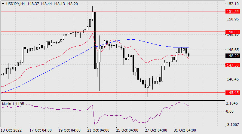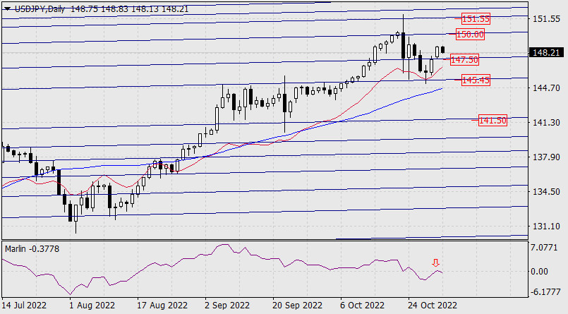 Прогноз по USD/JPY на 1 ноября 2022 годаИнстаФорекс - Instaforex, 3 года назад Пара USD/JPY вчера подросла на 130 пунктов, остановившись посередине пути к сопротивлению 150.00. Остановка была вызвана разворотом сигнальной линии осциллятора Марлин он нулевой линии. С наибольшей вероятностью цена предпримет нисходящий сценарий, то есть преодолеет поддержку 147.50 и далее спустится к линии ценового канала в область 145.45, куда уже стремится линия Крузенштерна. Это ключевой уровень, преодоление которого, либо разворот от которого определит дальнейшее среднесрочное движение цены. На текущий момент небольшое преимущество у варианта с дальнейшим продвижением к 141.50.
