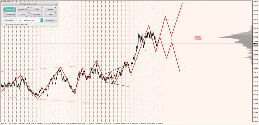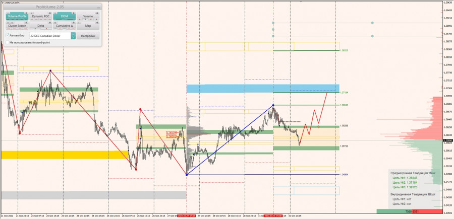 Среднесрочная тенденция: в лонг. Максимальное скопление объемов среднесрочной тенденции расположено в диапазоне по котировкам 1.36001-1.36104. В настоящий момент по паре совершаются инвестиционные операции ниже, указывая на слабость покупателей.