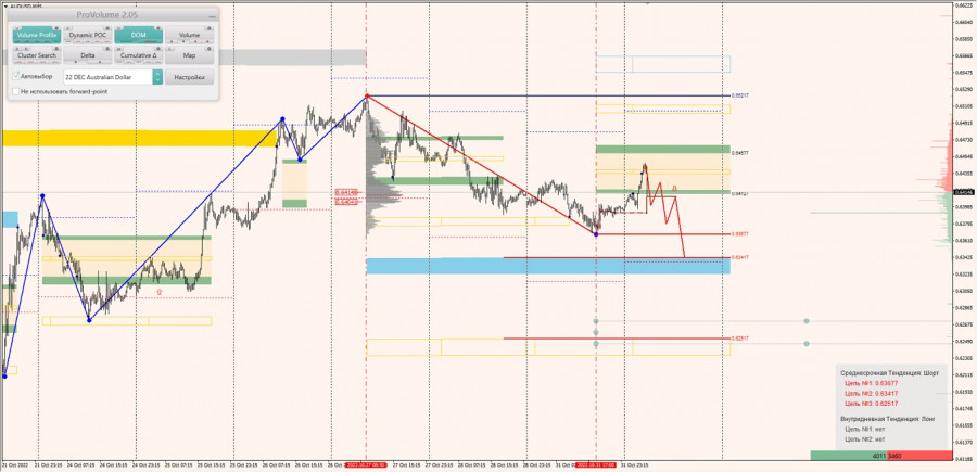 Среднесрочная тенденция: в шорт. Максимальное скопление объемов среднесрочной тенденции расположено в диапазоне по котировкам 0.64041-0.64148. В настоящий момент по паре совершаются инвестиционные операции выше, указывая на слабость продавцов.