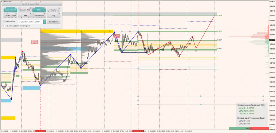 Среднесрочная тенденция: в лонг. Максимальное скопление объемов среднесрочной тенденции расположено в диапазоне по котировкам 0.58260-0.58333. В настоящий момент по паре совершаются инвестиционные операции выше, указывая на силу покупателей. Объемы последнего импульса по котировкам 0.58504-0.58573, и в настоящий момент пара торгуется ниже, указывая на временную слабость покупателей. Также наблюдаем технический слом основного среднесрочного тренда. Максимальное сокращение рисков!!!