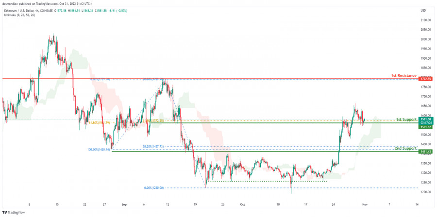 ETH/USD развивает бычий импульс. Прогноз на 1 ноября 2022ИнстаФорекс - Instaforex, 3 года назад На 4-часовом графике пара ETH/USD торгуется в бычьем тренде. Цена находится выше облака Ишимоку, что указывает на бычий импульс. Ночью цена набрала нисходящий импульс, и в настоящее время движется вдоль 1-го уровня поддержки 1561.62, соответствующего 61.8% уровню коррекции Фибоначчи. Если этот бычий импульс сохранится, ожидается, что цена направится к 1-му уровню сопротивления 1792.55, который соответствует предыдущему уровню свинг-хай и 100% уровню коррекции Фибоначчи. Торговая рекомендация Вход: 1561.62. Условия для входа: вход в покупку в области, где расположен уровень коррекции Фибоначчи 61.8%. Тейк-профит: 1792.55. Условия для фиксации прибыли: предыдущий хай и уровень коррекции Фибоначчи 100%. Стоп-лосс: 1400.00. Условия для активации ордера стоп-лосс: чуть ниже области, соответствующей 2-му уровню поддержки и предыдущему уровню свинг-лоу. Материал предоставлен компанией InstaForex - www.instaforex.com |