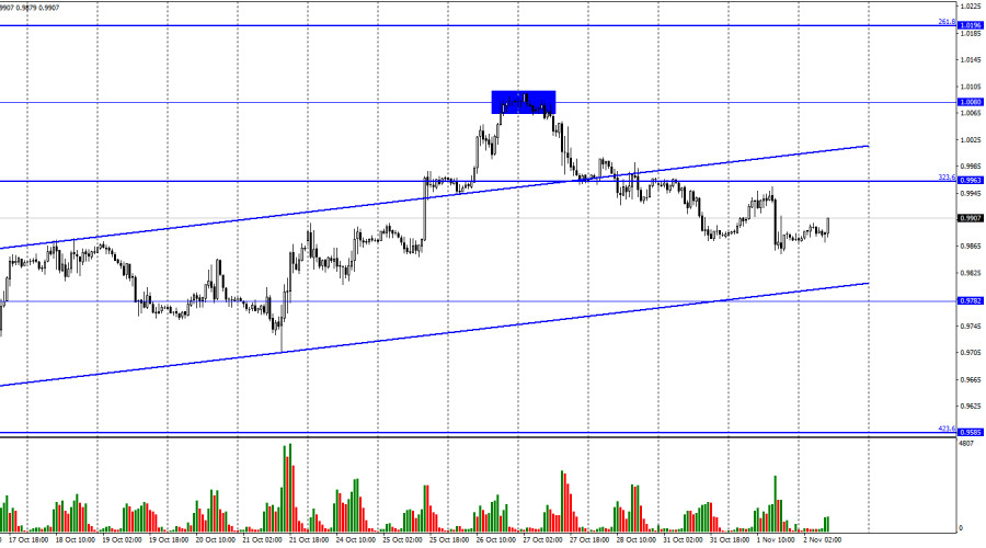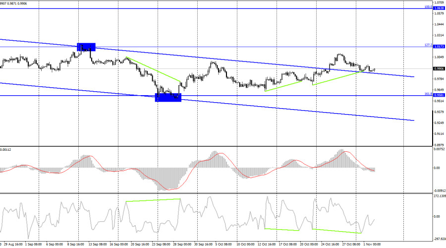 EUR/USD. 2 ноября. Доллар продолжает умеренно расти перед заседанием ФРСИнстаФорекс - Instaforex, 3 года назад Добрый день, уважаемые трейдеры! Пара EUR/USD во вторник выполнила разворот в пользу валюты ЕС и небольшой рост в направлении коррекционного уровня 323,6% - 0,9963. Однако, не дойдя до этого уровня всего несколько пунктов, был выполнен разворот в пользу доллара США и началось новое падение, которое закончилось ниже лоу предыдущего дня. Пара продолжает оставаться внутри восходящего трендового коридора, который характеризует настроение трейдеров, как «бычье». Закрепление котировок под ним повысит вероятность дальнейшего падения в направлении следующего уровня Фибо 423,6% - 0,9585. Вчерашний рост доллара во второй половине дня мог быть связан только с данными по деловой активности в секторе производства США. Индекс S&P упал с 52 до 50,4, а более важный индекс ISM – с 50,9 до 50,2. Примечательно, что трейдеры ожидали более слабых значений, поэтому доллар и мог вырасти, хотя оба показателя снизились в октябре. Однако был и еще один отчет, который мог оказать благоприятное влияние на валюту США. Количество открытых вакансий JOLT составило 10,7 млн при прогнозе 10 млн. Таким образом, проблем с работой в США нет, рынок труда остается достаточно сильным, а уровень безработицы – на минимальном за 50 лет значении. Эта информация и могла поддержать трейдеров-медведей. Однако сегодня вечером состоится событие, которого многие трейдеры долго ждали. Заседание ФРС. О нем я расскажу чуть подробнее в статье по фунт-доллару, а пока хотел бы отметить, что судьба евровалюты сейчас уже больше зависит не от ФРС, а от ЕЦБ. ФРС потихоньку приближается к тому уровню ставки, дальше которого чиновники уже не пойдут. А ЕЦБ еще далек от уровня ставки, который приведет хотя бы к небольшому замедлению инфляции в ЕС. Вчера стало известно, что президент Бундесбанка Йоахим Нагель поддерживает дальнейшее агрессивное ужесточение денежно-кредитной политики. Если его поддержат и другие члены ДКП ЕЦБ, то ставка ЕЦБ может расти еще довольно долго и довольно сильно, что поддержит уже трейдеров-быков. На 4-часовом графике пара выполнила закрепление над нисходящим трендовым коридором и может продолжить процесс роста в направлении уровня коррекции 127,2% - 1,0173. Я считаю, что это ключевой момент этого месяца, так как именно это закрепление меняет графическую картину с «медвежьей» на «бычью». Также была образована «бычья» дивергенция у индикатора CCI, которая повышает вероятность дальнейшего роста евровалюты. Отчет Commitments of Traders (COT):