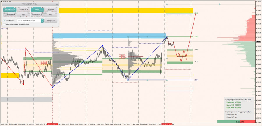 Среднесрочная тенденция: в шорт. Максимальное скопление объемов среднесрочной тенденции расположено в диапазоне по котировкам 1.37152-1.37259. В настоящий момент по паре совершаются инвестиционные операции ниже, указывая на силу продавцов. Объемы последнего импульса по котировкам 1.35550-1.35673, и в настоящий момент пара торгуется выше, что указывает на слабость покупателей.