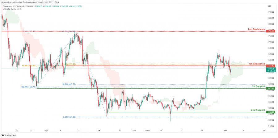 ETH/USD: ожидается формирование бычьего импульса. Прогноз на 3 ноября 2022 г.ИнстаФорекс - Instaforex, 3 года назад На 4-часовом графике пара ETH/USD торгуется в бычьем тренде. Накануне цена испытала повышенную волатильность из-за выхода новостей касательно заседания Комитета по операциям на открытом рынке (FOMC) ФРС США и закрылась ниже 1-го уровня сопротивления 1561.62, соответствующего уровню коррекции Фибоначчи 61.8%. Ожидается, что цена откатится вверх и повторно протестирует 1-й уровень сопротивления. Торговая рекомендация Вход: 1561.62 Условия для входа: вход в продажу с целью повторного тестирования 1-го уровня сопротивления Тейк-профит: 1411.43 Условия для фиксации прибыли: предыдущий лоу и уровни коррекции Фибоначчи 100% и 38.2% Стоп-лосс: 1663.98 Условия для активации ордера стоп-лосс: область, где располагался предыдущий хай Материал предоставлен компанией InstaForex - www.instaforex.com |