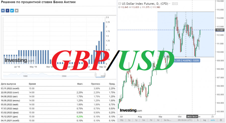 GBP/USD: заседание Банка АнглииИнстаФорекс - Instaforex, 3 года назад В четверг доллар продолжил вчерашний бурный рост. Как известно, по итогам завершившегося вчера заседания руководители ФРС единогласно и ожидаемо повысили процентную ставку на 0,75%. Однако, это решение не вызвало укрепления доллара. Наоборот, в первые минуты после публикации решения ФРС по ставкам доллар резко ослаб. Доллар стал резко укрепляться через 30 минут, когда началась пресс-конференция ФРС, в ходе которой ее глава Джером Пауэлл дал весьма ястребиную оценку перспективам монетарной политики американского центрального банка на ближайшие месяцы. «Сейчас очень преждевременно думать о паузе, очень преждевременно даже говорить об этом», - заявил Пауэлл в ходе этой пресс-конференции, пообещав также в декабре дать «обновленное представление о том, куда должны будут двигаться ставки». При этом он все же внес некоторую интригу, сказав, что «время для замедления повышения ставок может наступить уже в декабре или феврале». Он признал, что «экономика США значительно замедлилась по сравнению с прошлым годом», но «без ценовой стабильности не добиться устойчивого сильного рынка труда». "Стабильность цен в США - это благо для мировой экономики", - подвел итог своим заявлениям Пауэлл. Таким образом, покупатели доллара получили от него достаточно сильные подтверждения в приверженности руководства ФРС к проведению жесткой политики, по крайней мере в ближайшие месяцы. В ходе сегодняшней азиатской торговой сессии наблюдалась некоторая нисходящая коррекция после вчерашнего сильного роста доллара. Однако, в начале сегодняшней европейской торговой сессии укрепление доллара возобновилось. На момент публикации данной статьи индекс доллара DXY находится вблизи отметки 112.60, на 125 пунктов выше цены открытия вчерашнего торгового дня, также вернувшись к отметкам 2-недельной давности и в верхнюю часть диапазона, образовавшегося между локальными уровнями поддержки и сопротивления 114.74 и 109.37. Сегодня ожидается очередной всплеск волатильности на валютном рынке. Прежде всего, это затронет британский фунт и пару GBP/USD: в 12:00 (GMT) будет опубликовано решение Банка Англии по процентной ставке, а в период времени с 12:30 до 14:00 будет опубликован целый блок важной макро статистики по США (подробнее см. в Важнейшие экономические события недели 31.10.2022 – 06.11.2022). Участники рынка ждут от Банка Англии очередного повышения процентной ставки, на 0,75% до уровня 3,0%. Это самое сильное единоразовое повышение ставки с конца 80-х годов, что говорит, во-первых, о высоком уровне инфляции в Великобритании и, во-вторых, о решимости руководства Банка Англии бороться с ней. Это – сильный фундаментальный бычий фактор для фунта. Тем не менее, наблюдается его ослабление, в том числе и в кросс-парах. Не исключено, что рынки учитывают более мягкое решение по процентной ставке, а также «голубиную» риторику последующих заявлений со стороны руководителей Банка Англии. Скорее всего, они представят сегодняшнее решение как исключительное, с намерением вернуться к более мелким шагам по повышению ставки. Если риторика сопутствующих заявлений действительно будет воспринята участниками рынка как голубиная, то это может столкнуть фунт еще глубже вниз. Несмотря на усилия банка, инфляция в Великобритании находится на многолетних макси