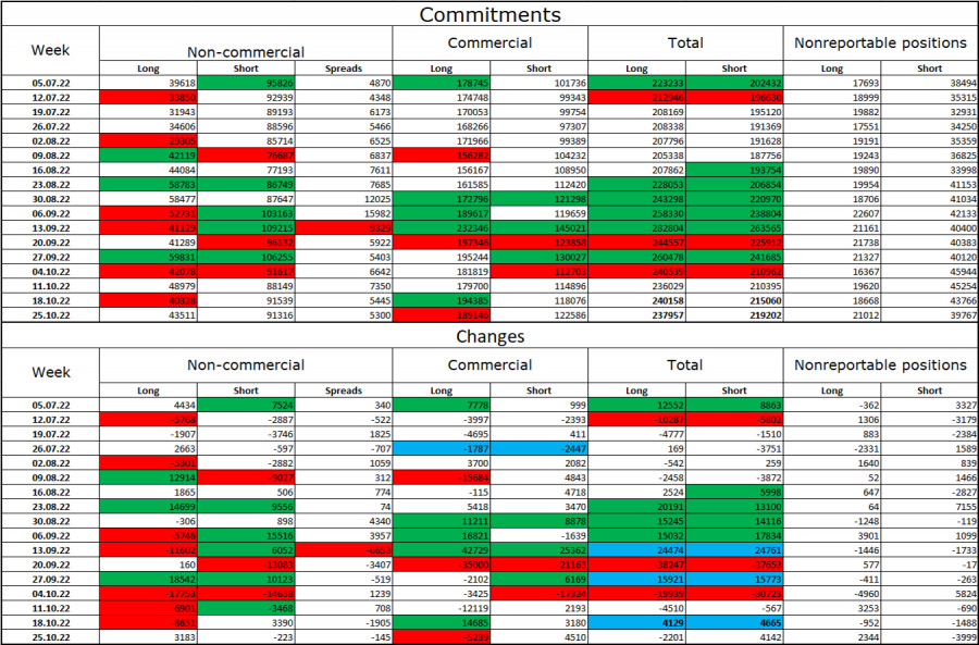 Добрый день, уважаемые трейдеры! На часовом графике пара GBP/USD в среду продолжила процесс падения, который усилился после того, как стали известны трейдерам результаты заседания FOMC. На момент написания статьи фунт упал уже на 230 пунктов и падение продолжается. Отбой от уровня Фибо 61,8% - 1,1210 может сработать в пользу британца и некоторого роста в направлении уровня коррекции 76,4% - 1,1411. Закрепление курса пары под уровнем 1,1210 повысит вероятность дальнейшего падения в направлении коррекционного уровня 50,0% - 1,1047. Помимо повышения ставок ФРС и «ястребиной» риторики Пауэлла, я могу отметить также его слова о том, что шансов на «мягкую посадку» для экономики США становится все меньше. Эти слова означают то, что ставка вырастет сильнее, чем ожидалось, поэтому экономика, вероятнее всего, столкнется с рецессией. Ранее FOMC ожидал, что ставку не придется задирать настолько высоко, поэтому были все основания предполагать, что период высоких ставок долго не продлится. Инфляция быстро пойдет вниз, а ФРС успеет начать смягчать политику до того, как экономика начнется сокращаться от квартала к кварталу. Сейчас надежд на такой сценарий мало. Но, как мы можем видеть, этот момент очень слабо волнуют трейдеров. Доллар растет и может продолжать этот рост сегодня. Уже через пару часов Банк Англии представит результаты своего заседания, а нас могут ждать новые мощные движения пары фунт-доллар. Мало, кто сомневается в том, что ставка Банка Англии тоже вырастет. Я ставлю на ее рост на 0,75%, но некоторые трейдеры допускают, что повышение может быть более скромным. Так или иначе, реакция будет. А еще через полчаса выступит с речью Эндрю Бейли, президент Банка Англии, и его риторика также будет очень важна. Вчера трейдеры реагировали даже не на само повышение ставки, а на слова, сказанные Пауэллом. Тоже самое может быть и сегодня, но уже в контексте Банка Англии. На 4-часовом графике пара выполнила закрепление под уровнем 1,1496 и начала сильный процесс падения в направлении коррекционного уровня 200,0% - 1,1111. Отбой котировок от этого уровня сработает в пользу британца и некоторого роста в направлении 1,1496. Закрытие под уровнем 1,1111 повысит вероятность дальнейшего падения в направлении лоу года. Отчет Commitments of Traders (COT):