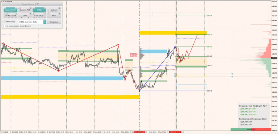 Среднесрочная тенденция: в лонг. Максимальное скопление объемов среднесрочной тенденции расположено в диапазоне по котировкам 0.64395-0.64478. В настоящий момент по паре совершаются инвестиционные операции ниже, указывая на слабость покупателей.