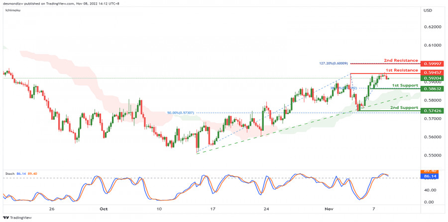 NZD/USD: ожидается формирование медвежьего импульса. Прогноз на 8 ноября 2022ИнстаФорекс - Instaforex, 3 года назад На 4-часовом графике пара NZD/USD разворачивается от 1-го уровня сопротивления, а индикатор Стохастик находится выше 80. Ожидается, что цена может упасть до 1-го уровня поддержки 0.58632, соответствующего уровню свинг-лоу и 38.2% уровню коррекции Фибоначчи. Если 1-й уровень поддержки будет пробит, цена направится ко 2-му уровню поддержки 0.57426, который соответствует 50% уровню коррекции Фибоначчи. В качестве альтернативы, поскольку цена находится выше облака Ишимоку и восходящей линии тренда, пара может подняться до 1-го уровня сопротивления 0.59320, соответствующего уровням свинг-хай. Прорыв 1-го уровня сопротивления направит цену ко 2-му уровню сопротивления 0.59997, соответствующему уровню расширения Фибоначчи 127.2%. Торговая рекомендация Вход: 0.59320. Условия для входа: уровни свинг-хай. Тейк-профит: 0.58632. Условия для фиксации прибыли: уровень свинг-лоу и 38.2% уровень коррекции Фибоначчи. Стоп-лосс: 0.59320. Условия для активации ордера стоп-лосс: уровни свинг-хай. Материал предоставлен компанией InstaForex - www.instaforex.com |