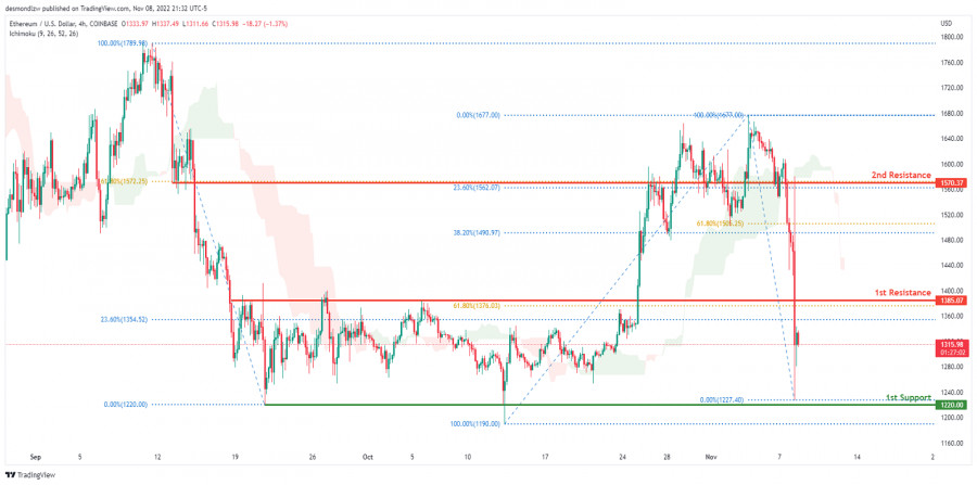 ETH/USD развивает медвежий импульс. Прогноз на 9 ноября 2022ИнстаФорекс - Instaforex, 3 года назад На 4-часовом графике пара ETH/USD движется в медвежьем тренде, а цена находится под облаком Ишимоку, что указывает на медвежий импульс. В настоящее время пара торгуется на уровне 1317.43. Если медвежий импульс сохранится, ожидается, что цена направится к 1-му уровню поддержки 1220.00, где расположен предыдущий лоу и 100% уровень коррекции Фибоначчи. В качестве альтернативы цена может развернуться и укрепиться, чтобы повторно протестировать 1-й уровень сопротивления 1385.07, соответствующий уровням коррекции Фибоначчи 23.6% и 61.8%. Торговая рекомендация Вход: 1490.97. Условия для входа: уровни коррекции Фибоначчи 38.2% и 61.8%. Тейк-профит: 1220.00. Условия для фиксации прибыли: область, где находится предыдущий лоу и уровень коррекции Фибоначчи 100%. Стоп-лосс: 1677.00. Условия для активации ордера стоп-лосс: область, где располагался предыдущий хай. Материал предоставлен компанией InstaForex - www.instaforex.com |