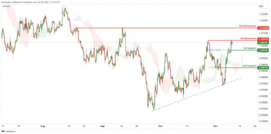 EUR/USD: ожидается усиление бычьего импульса. Прогноз на 9 ноября 2022 г.ИнстаФорекс - Instaforex, 3 года назад На 4-часовом графике пара EUR/USD движется выше облака Ишимоку и восходящей линии тренда, что указывает на бычий импульс. Ожидается, что цена может подняться до 1-го уровня сопротивления 1.00928, соответствующего уровням свинг-хай. Если 1-й уровень сопротивления будет пробит, цена направится ко 2-му уровню сопротивления 1.01908, который соответствует предыдущим уровням свинг-хай. В качестве альтернативы цена может упасть до 1-го уровня поддержки 1.00150, где расположен уровень коррекции Фибоначчи 23.6%. Прорыв 1-го уровня поддержки направит цену ко 2-му уровню поддержки 0.98754, соответствующему уровню коррекции Фибоначчи 61.8%. Торговая рекомендация Вход: 1.00928 Условия для входа: уровни свинг-хай Тейк-профит: 1.01908 Условия для фиксации прибыли: предыдущие уровни свинг-хай Стоп-лосс: 1.00150 Условия для активации ордера стоп-лосс: 23.6% уровень коррекции Фибоначчи Материал предоставлен компанией InstaForex - www.instaforex.com |