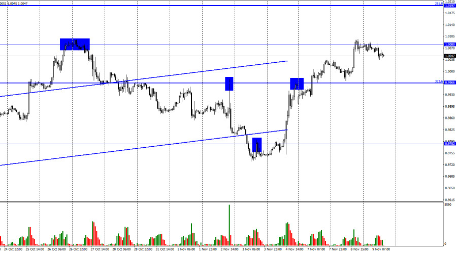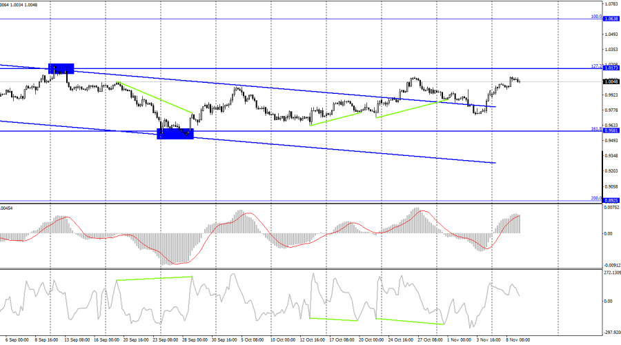 EUR/USD. 9 ноября. Трейдеры-быки продолжают атаковать при пустом календаре макроэкономических событийИнстаФорекс - Instaforex, 3 года назад Добрый день, уважаемые трейдеры! Пара EUR/USD во вторник продолжала процесс роста и достигла уровень 1,0080. Отбой от этого уровня сработал в пользу американской валюты и начала падения в направлении уровня коррекции 323,6% - 0,9966. Закрытие курса пары над уровнем 1,0080 повысит вероятность дальнейшего роста в направлении следующего уровня Фибо 261,8% - 1,0197. Таким образом, европейская валюта показывает рост уже четыре полных дня, чем немало озадачивает лично меня. Дело в том, что на этой неделе еще не было ни одного важного экономического события, чтобы евро показывал такой уверенный рост. Пожалуй, наиболее интересным событием первых трех дней недели стали промежуточные выборы в Сенат и Парламент США, на которых лидируют пока республиканцы. Напомню, что до выборов в обеих палатах лидерство занимали демократы, однако президент Джо Байден и его партия неоднократно критиковались, поэтому власть, похоже, переходит в руки их конкурентов. Окончательных результатов еще нет, и Сенат демократы могут сохранить за собой. Пока что между ними и представителями Республиканской партии там полное равенство, но так было и до выборов, просто решающий голос в таких случаях отдается вице-президенту страны. То есть Камале Харрис, которая является представителем Демократической партии. Таким образом, в лучшем случае демократы оставят за собой Сенат, но отдадут республиканцам нижнюю палату. Отчасти падение доллара может быть связано с этим событием, однако я не верю в это. Это всего лишь промежуточные выборы, и даже если произойдут существенные перестановки в Парламенте, из-за чего падает доллар? Придут ко власти республиканцы? Нет. Президентом все также останется Джо Байден, а в Сенате большинства у них не будет. Таким образом, в некоторых областях могут последовать изменения, но не одномоментные и не быстрые. А для доллара вряд ли что-то поменяется, так как его судьба больше находится в руках ФРС, который является независимым органом. На 4-часовом графике пара выполнила новый разворот в пользу валюты ЕС и возобновила процесс роста в направлении коррекционного уровня 127,2% - 1,0173. Ранее пара выполнила закрепление над нисходящим трендовым коридором, что является крайне важным моментом, так как меняет настроение трейдеров на «бычье». Отбой от уровня 1,0173 может сработать в пользу некоторого падения. Отчет Commitments of Traders (COT):