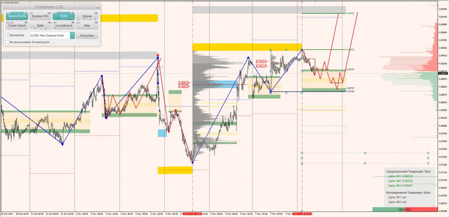 Среднесрочная тенденция: в лонг. Максимальное скопление объемов среднесрочной тенденции расположено в диапазоне по котировкам 0.59241-0.59328. В настоящий момент по паре совершаются инвестиционные операции ниже, указывая на слабость покупателей. Наблюдаем технический слом среднесрочного тренда. Риски уменьшаем максимально, при возможном входе в лонговую позицию.